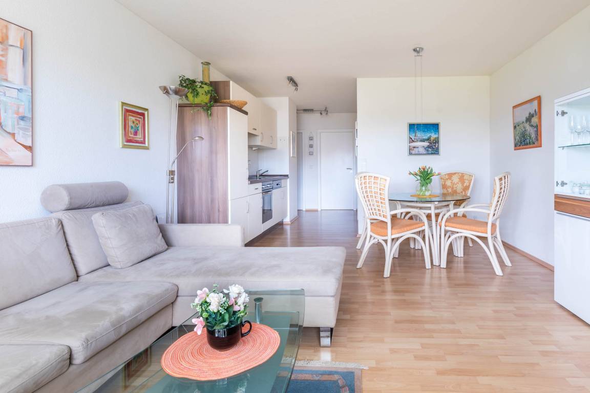Vom Wohnzimmer aus hat man direkten Zugang zum möblierten Ost-Balkon.