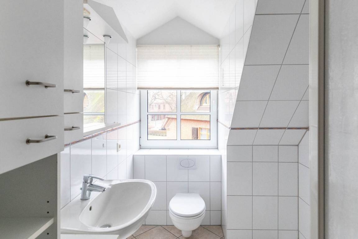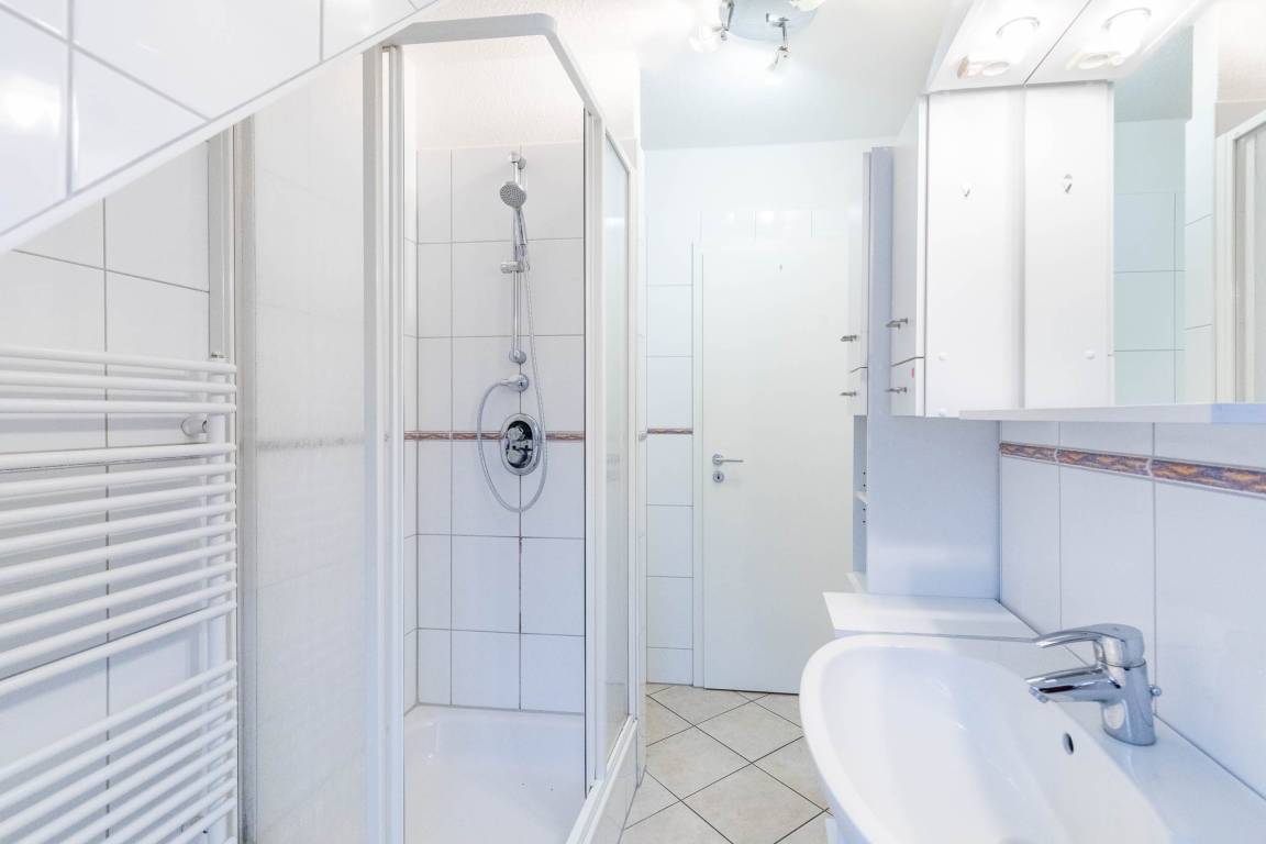 Im Bad mit Fenster findet man eine Dusche (Einstiegshöhe 30cm), einen Waschtisch, ein WC und einen praktischen Handtuchtrockner.