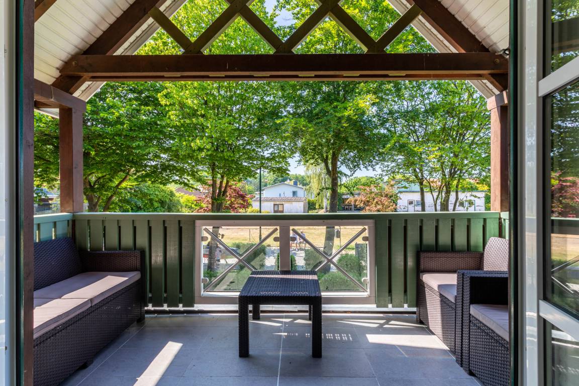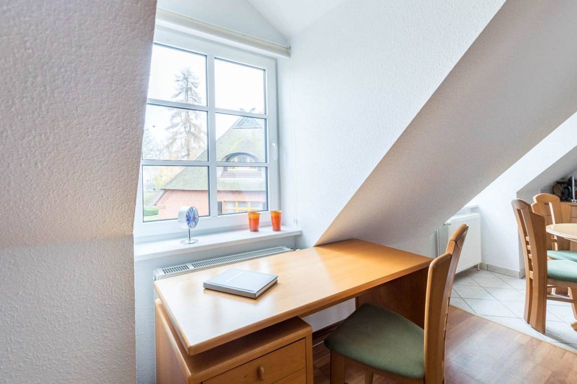 In der 2. Wohnebene, im Dachgeschoss befinden sich die offene Schlafgalerie mit einem Doppelbett (160x200cm, getrennte Matratzen, Lattenroste am Kopf verstellbar), eine Kommode sowie eine gemütliche Leseecke, die mit SAT-TV und DVD-Player ausgestattet ist. Das Schlafzimmer lässt sich mit einem Rollo abdunkeln. Das Schlafsofa bietet eine weitere Option zum Nächtigen (Liegefläche 80x200cm).