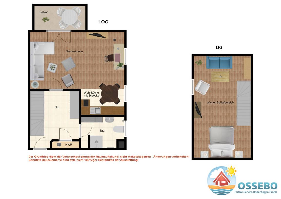 Die 2-Zimmer-Ferienwohnung für max. 4 Gäste im 1.OG erstreckt sich über 2 Wohnebenen und wartet mit einer gemütlichen Ausstattung auf Sie.