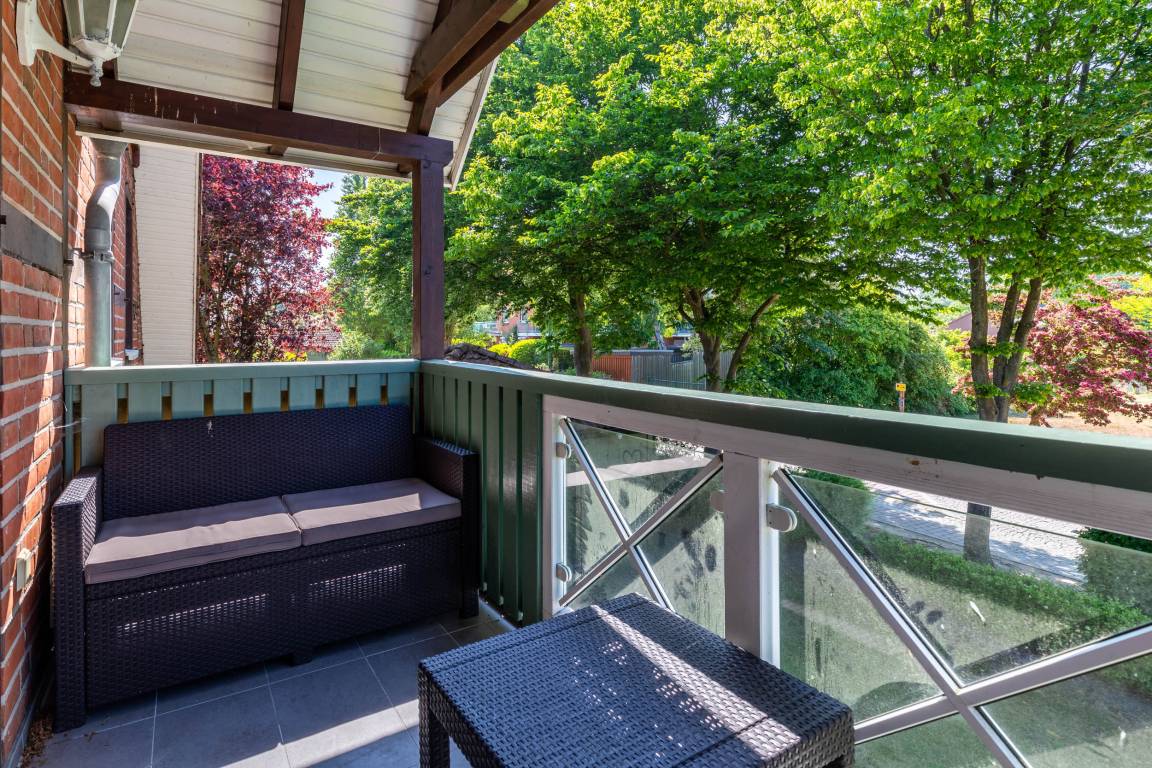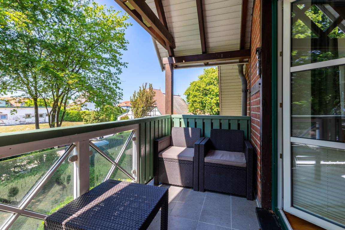 Vom Wohnbereich betreten Sie den möblierten Nordwest-Balkon, auf dem die frische Ostseeluft und der Blick im Winter aufs Meer durch die Bäume genossen werden können.