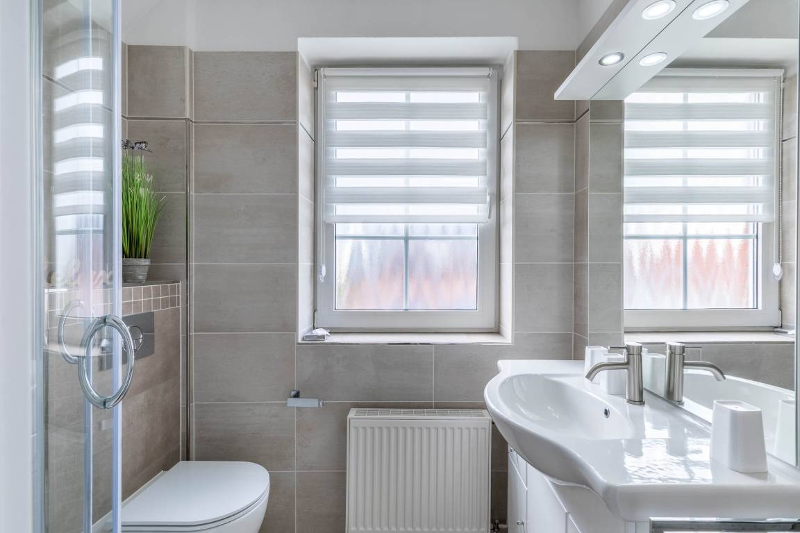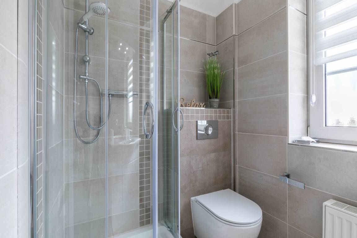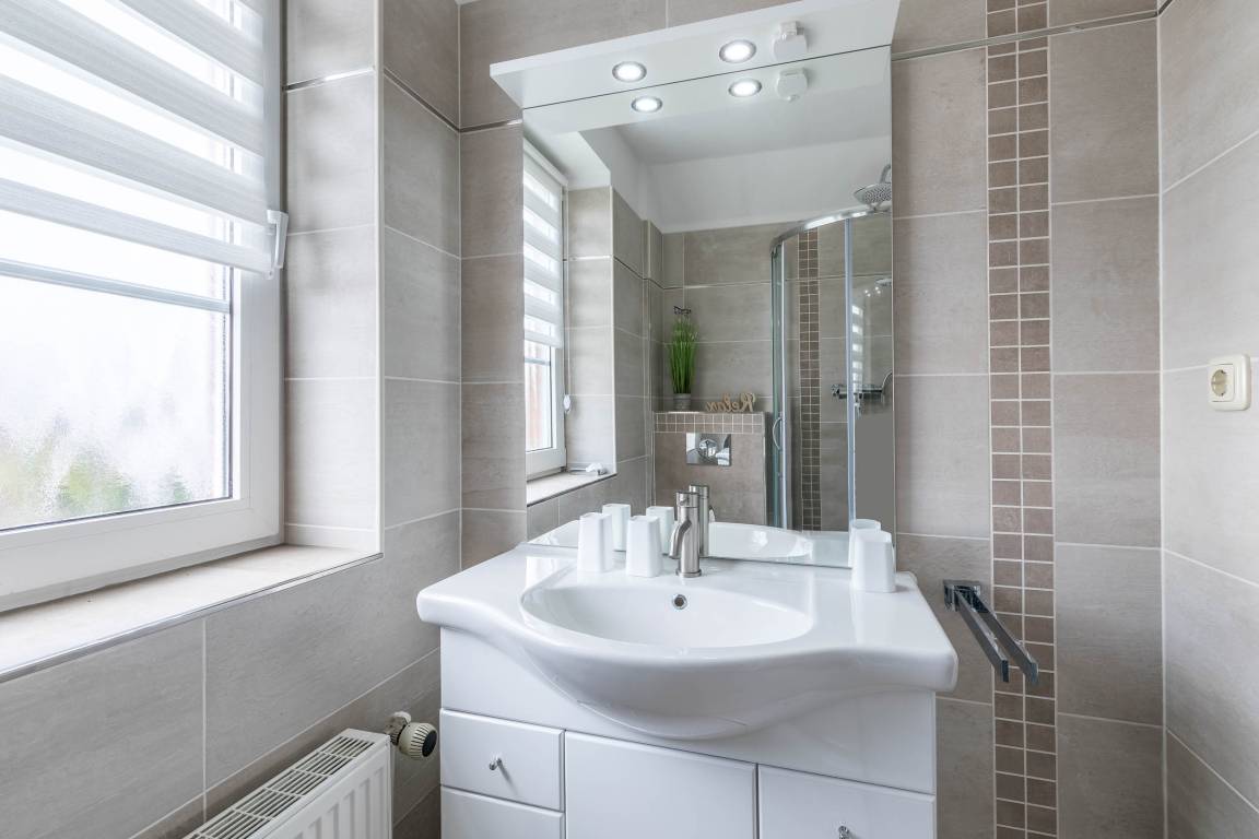 Das moderne Duschbad mit viel Tageslicht ist mit Dusche, WC und Waschtisch ausgestattet.