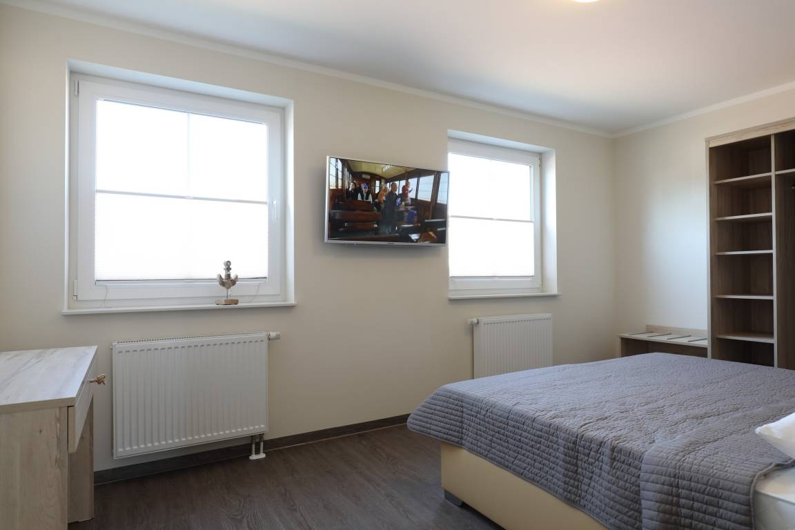 Das Schlafzimmer ist mit einem Doppelbett und einem geräumigen Kleiderschrank ausgestattet. Auch das Schlafzimmer verfügt über einen Flatscreen-TV.