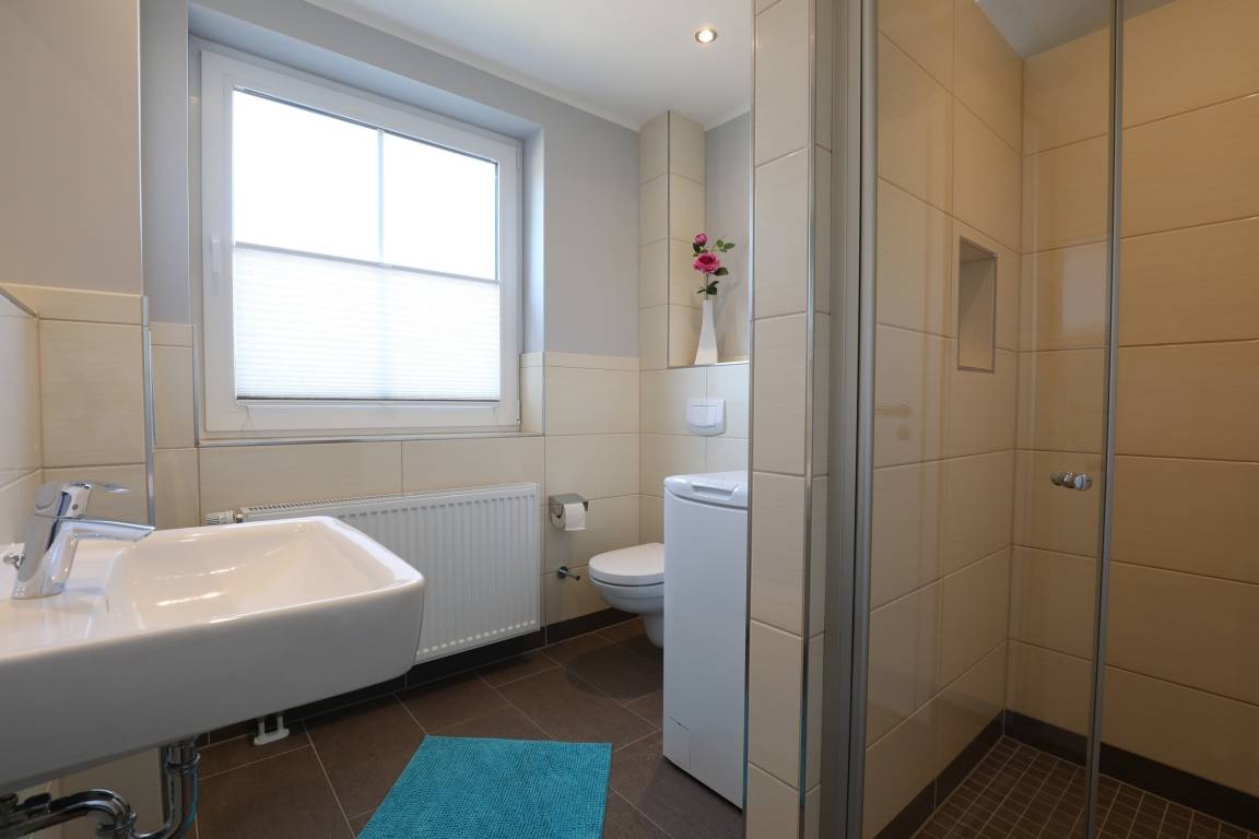 Ein großes Bad mit Tageslicht bietet eine barrierefreie Dusche, Waschbecken, WC und auch eine Waschmaschine.