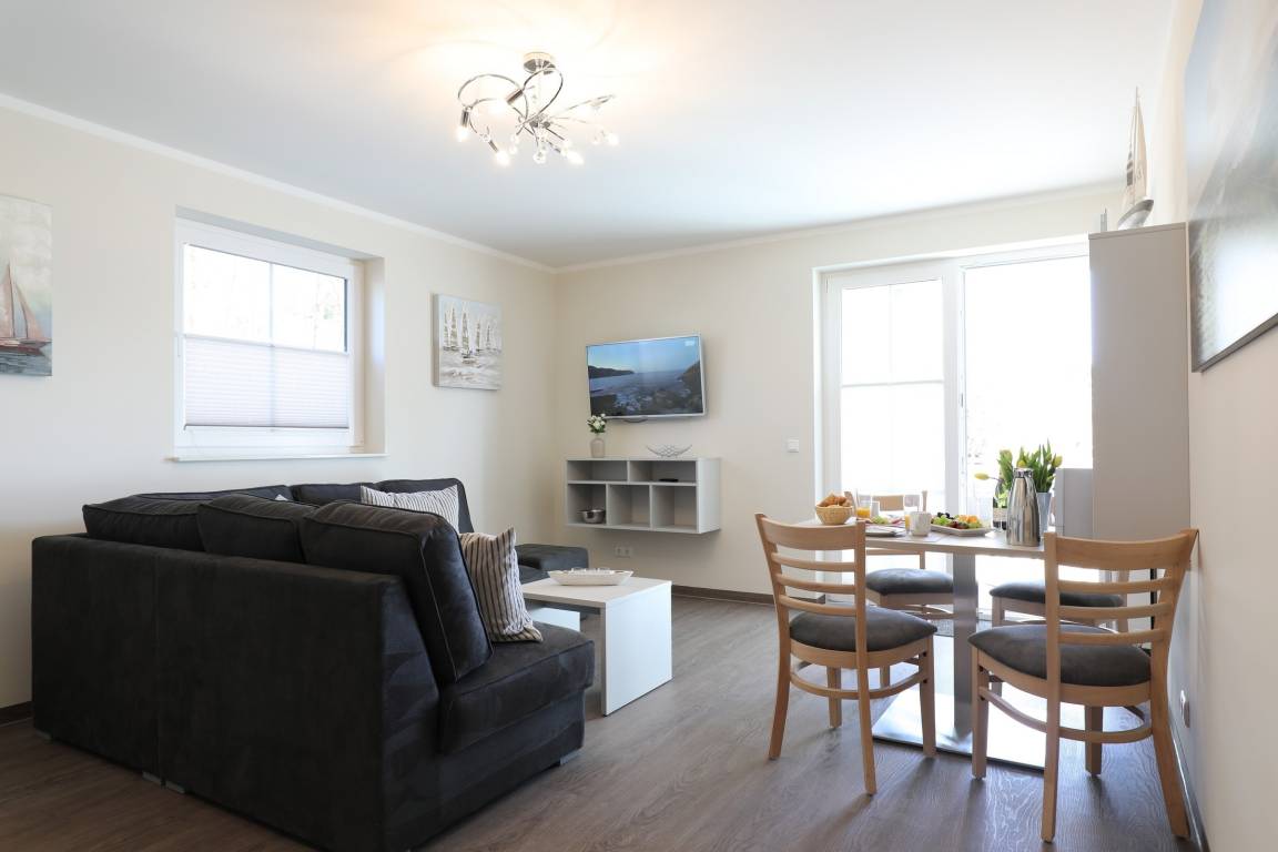 Das bequeme Sofa lädt zum gemütlichen Beisammensein oder zum Entspannen beim Fernsehen ein. Zur gut ausgestatteten Wohnküche gehört auch ein schöner Essbereich für Zwei.