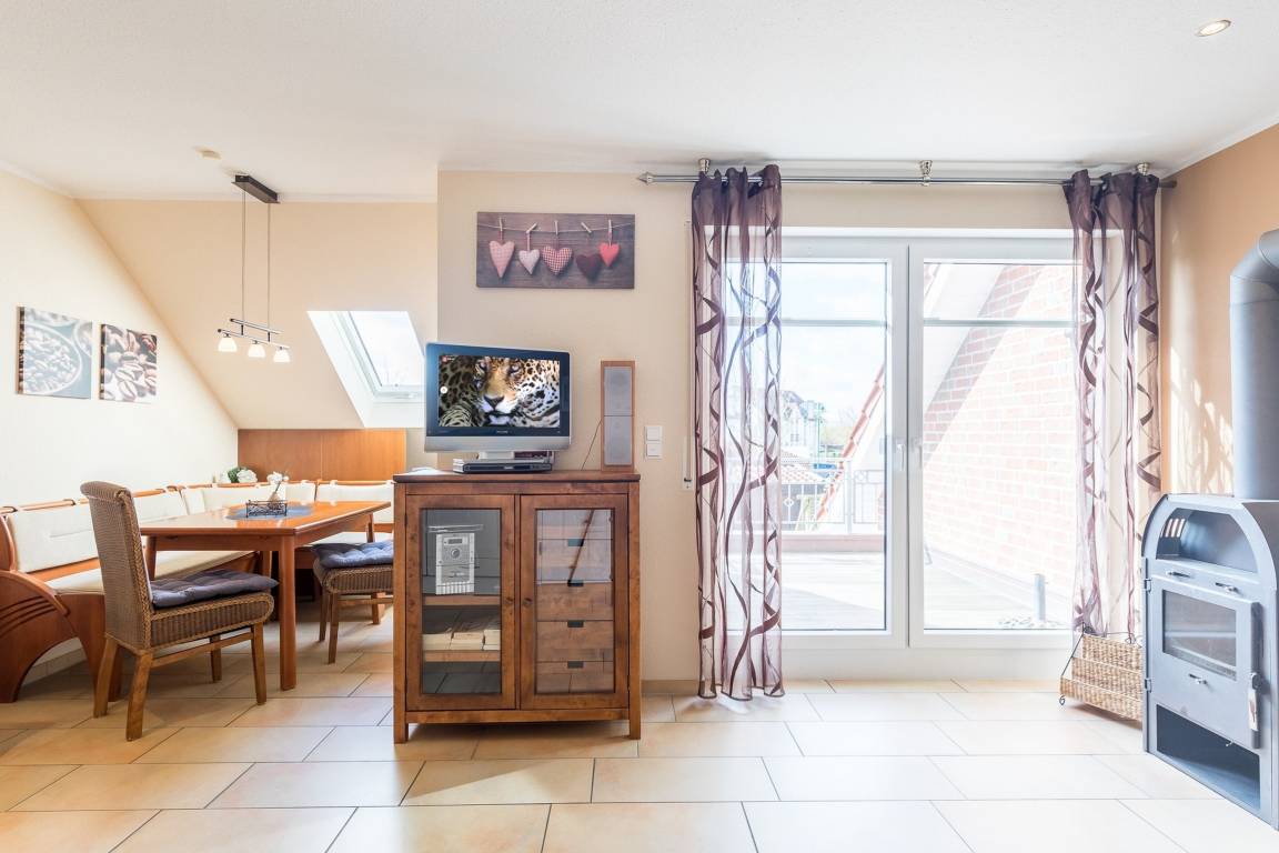 Im Wohnbereich befindet sich zudem eine gemütliche Sitzgruppe mit Blick auf den Kamin und den modernen Flachbildfernseher. Der von hier aus begehbare Südbalkon ist voll möbliert.