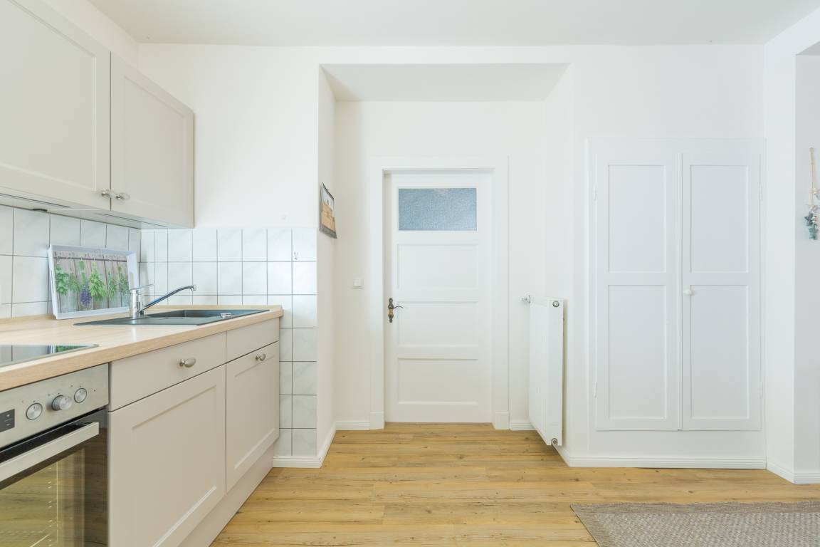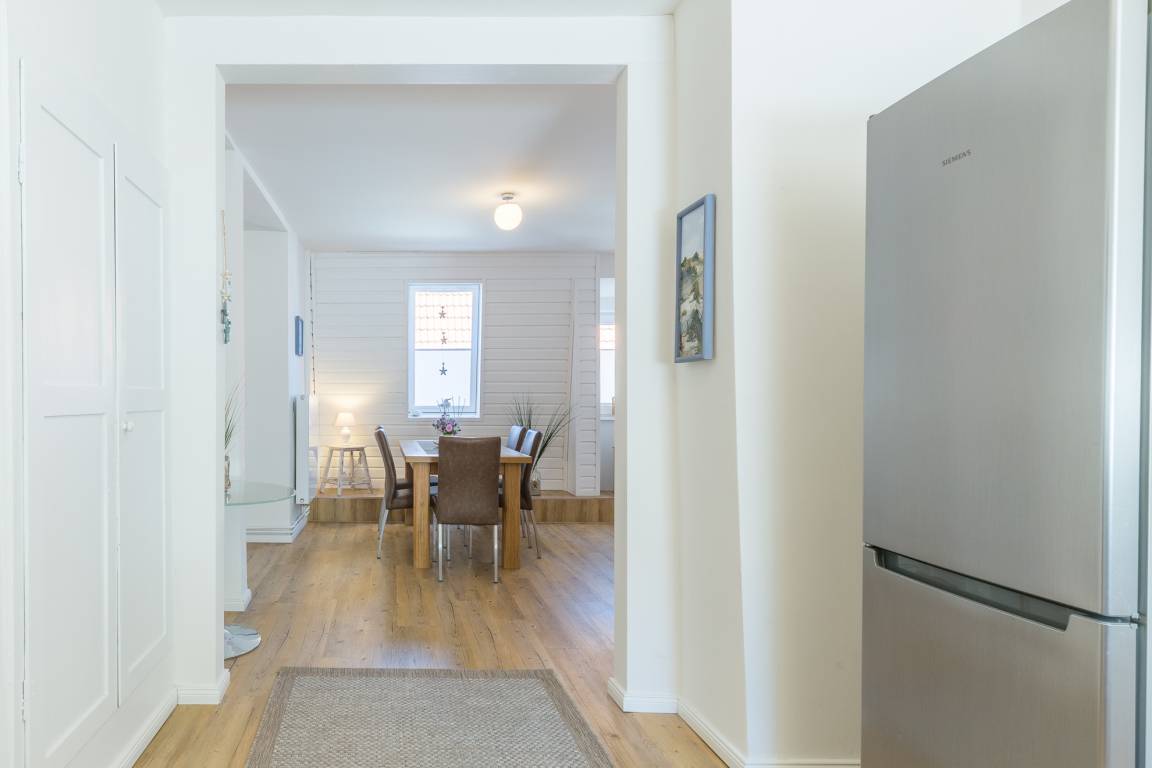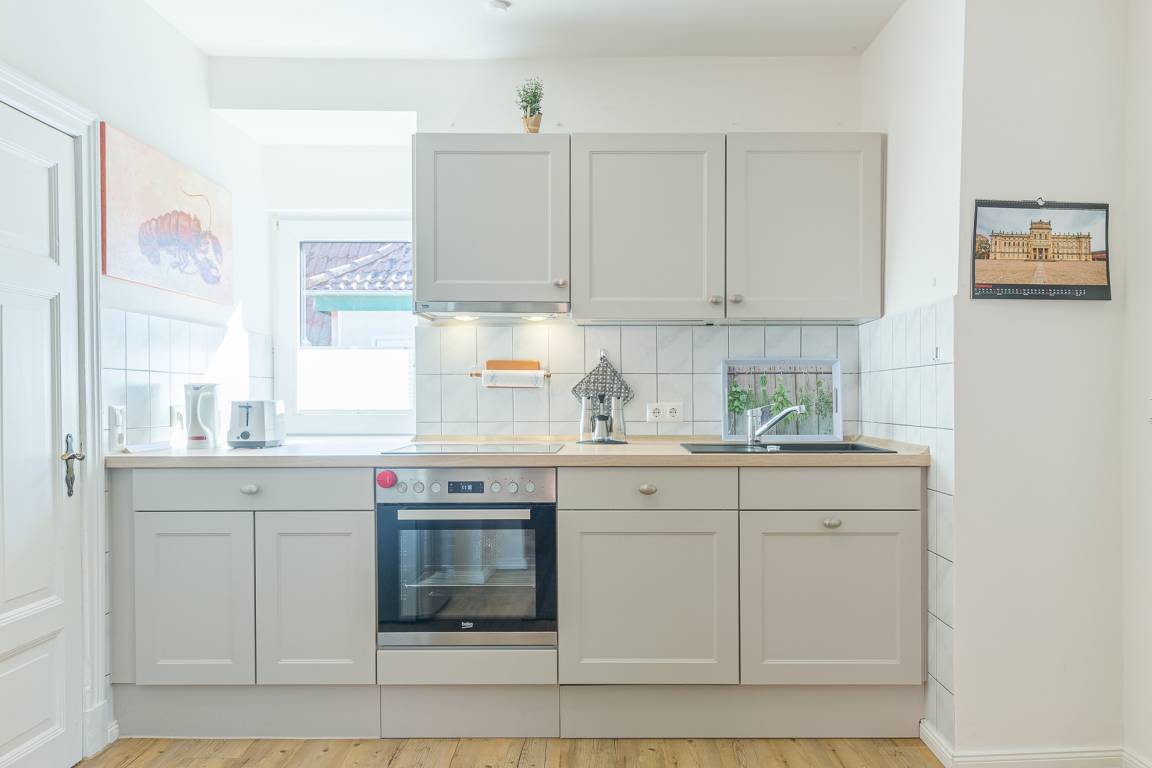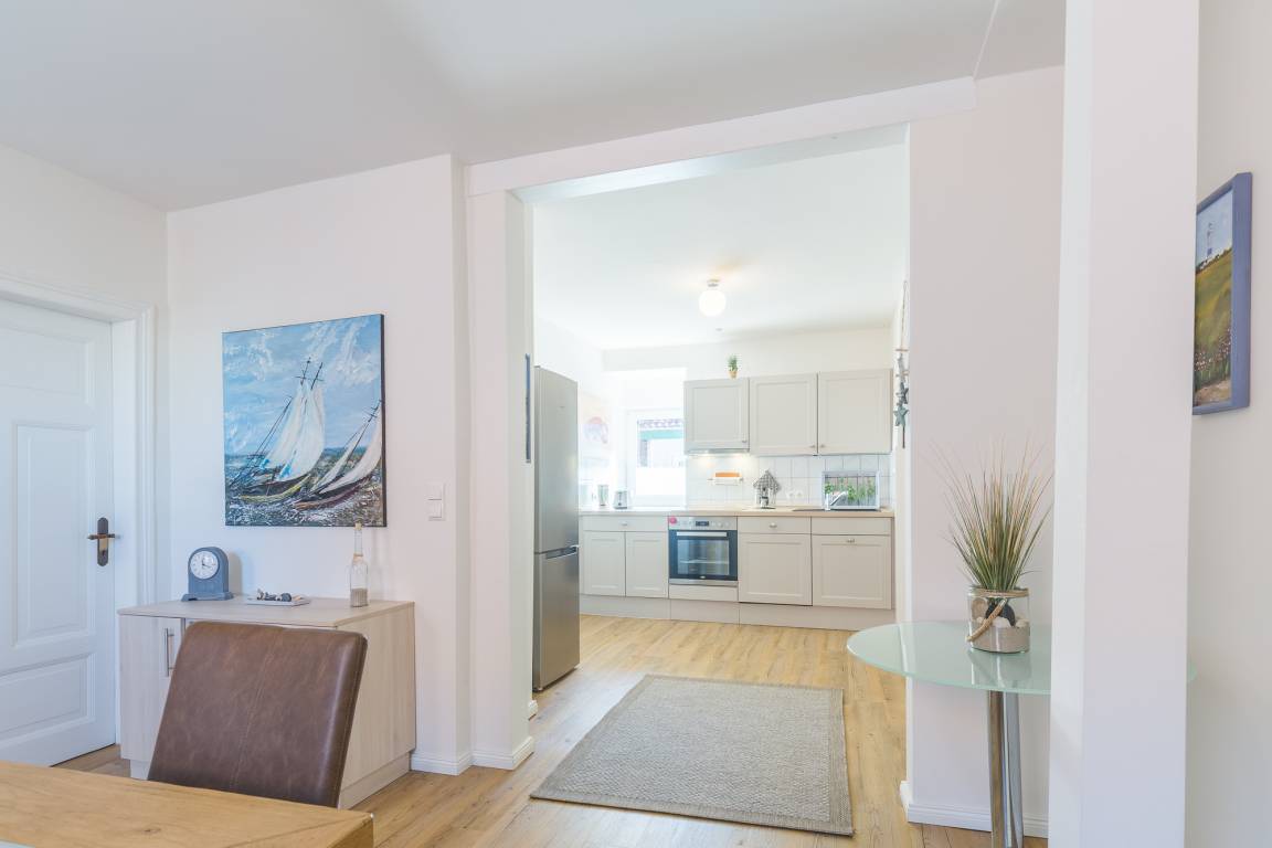 Sie betreten die Wohnung an der Seite des Hauses durch den Seiteneingang. Von hier aus gelangen Sie über die Treppe ins erste OG. Hinter der Wohnungseingangstür befindet sich im Eingangsbereich der Ferienwohnung die große Wohnküche. Die Küche ist voll ausgestattet mit Backofen, Spülmaschine und Cerankochfeld.