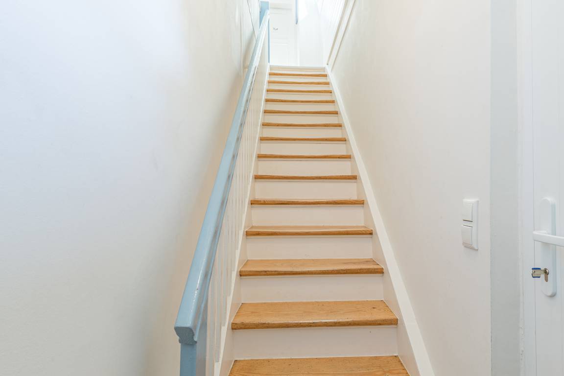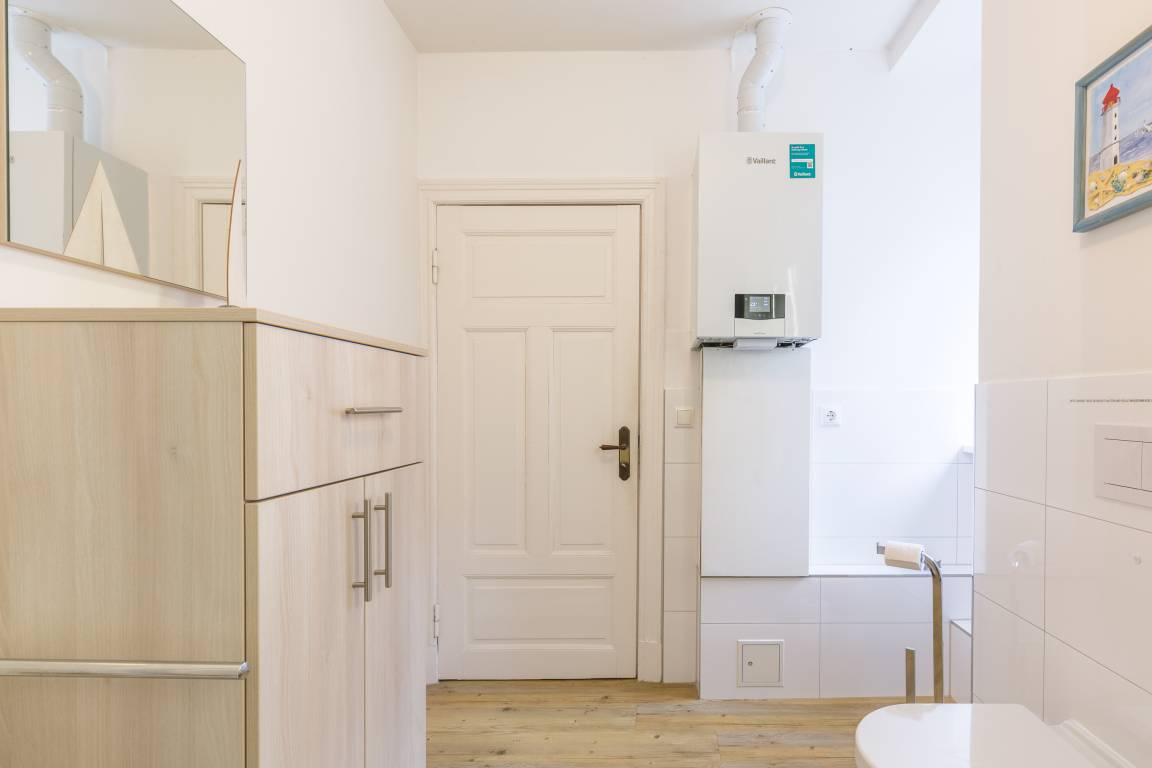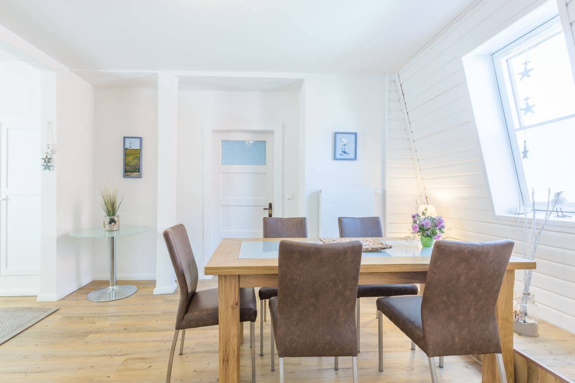 Der angrenzende Essbereich bietet Platz für 4 Personen im Familienurlaub oder im Urlaub mit Freunden. Neben der Wohnküche und dem Essbereich finden Sie hier im 1. OG zwei Schlafzimmer und ein Badezimmer vor.