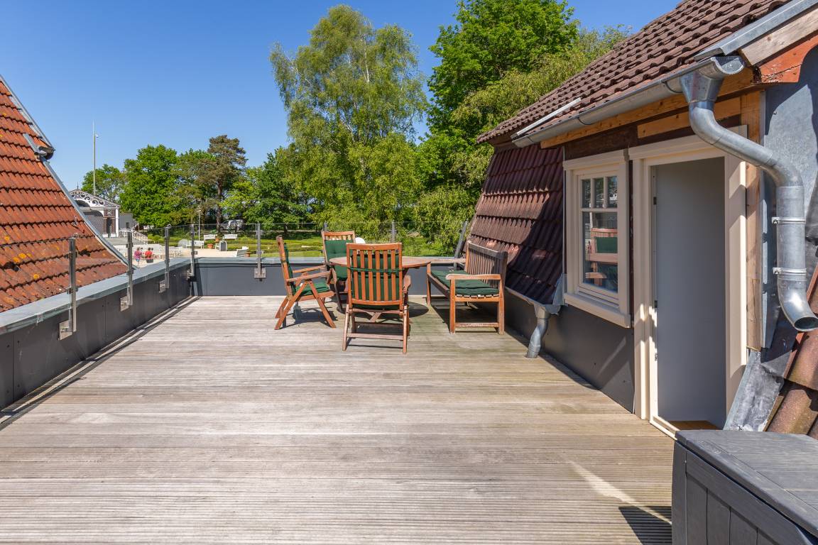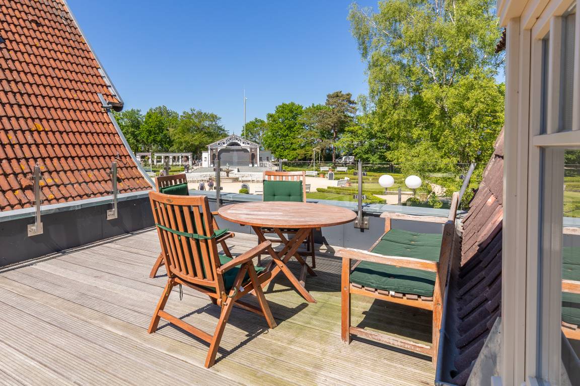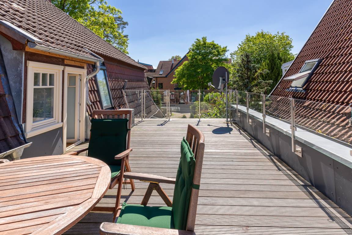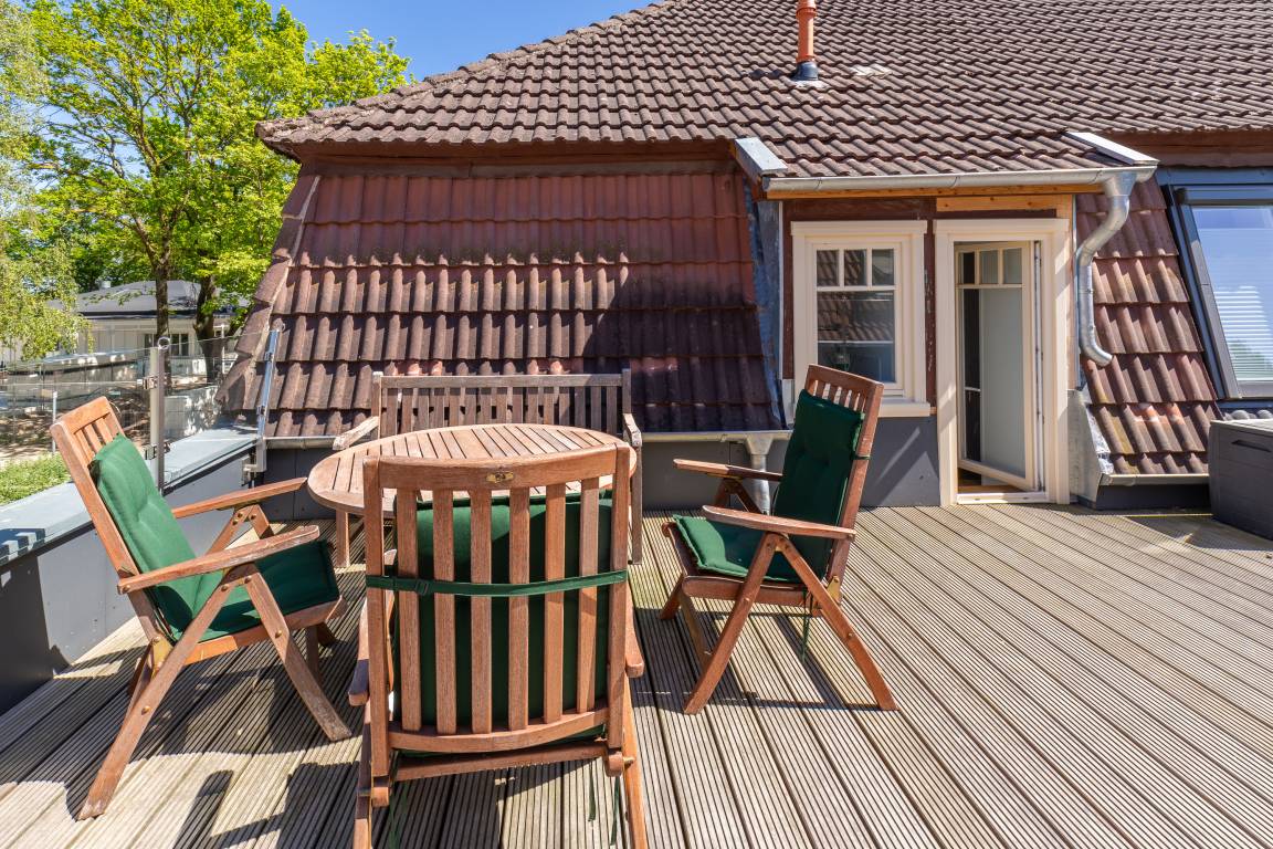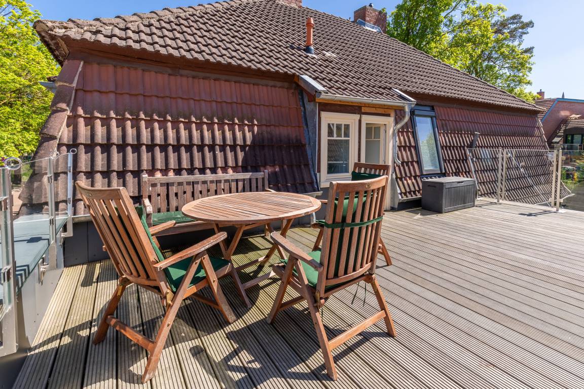 Durch einen kleinen Ausstieg gelangen Sie aus dem Essbereich direkt auf die Dachterrasse. Hier ist Grillen nicht gestattet.