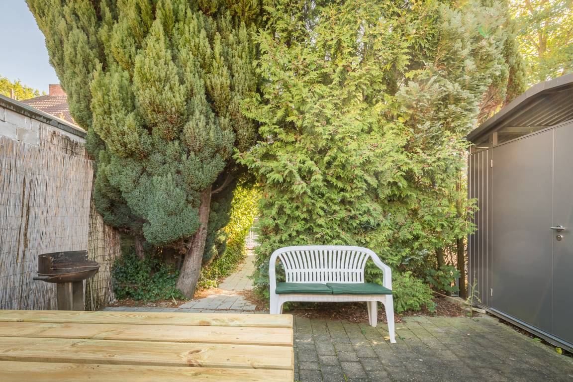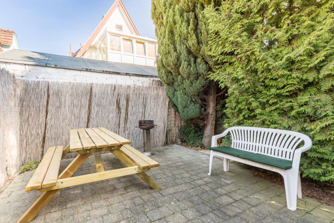 An langen Sommertagen steht Ihnen auf der Rückseite des Grundstückes ein zweiter Platz als Terrasse zur Verfügung. Um auf die Terrasse zu gelangen, verlassen Sie die Ferienwohnung durch den Hauseingang und laufen zum Ende des Grundstücks.