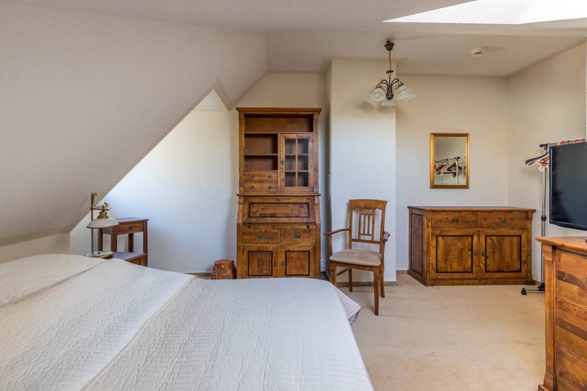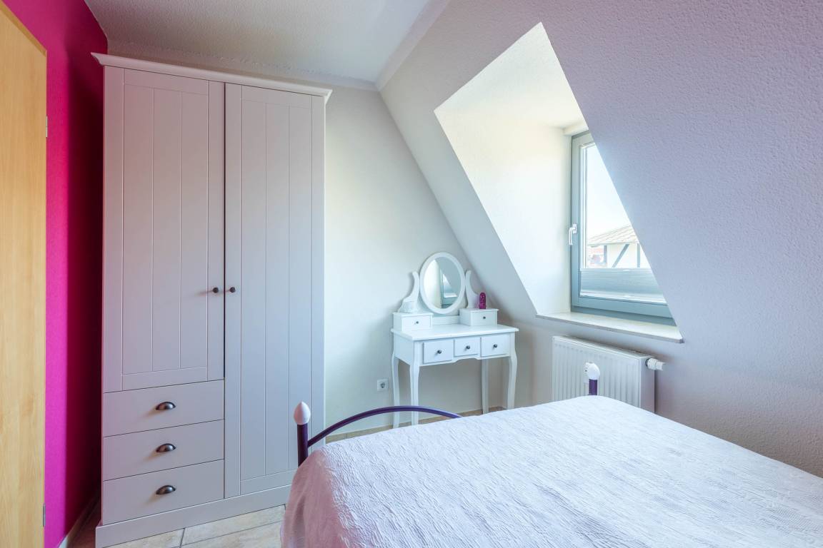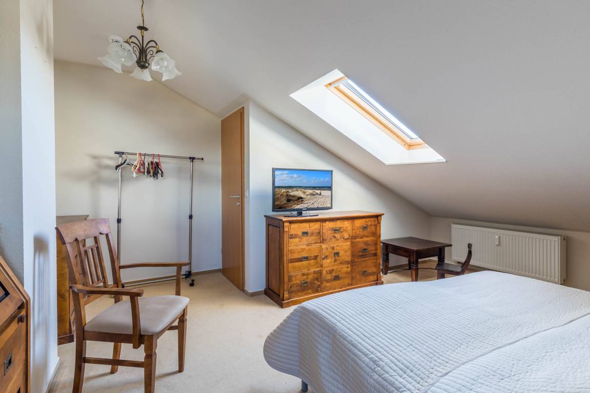 Ebenso befinden sich auf dieser Ebene zwei der insgesamt drei Schlafzimmer: in dem kleineren Schlafzimmer steht ein kleines französisches Doppelbett (140x200cm) und ein Kleiderschrank bereit. Das zweite Schlafzimmer ist mit einem Doppelbett (180x200cm) und ebenfalls einem Kleiderschrank ausgestattet.