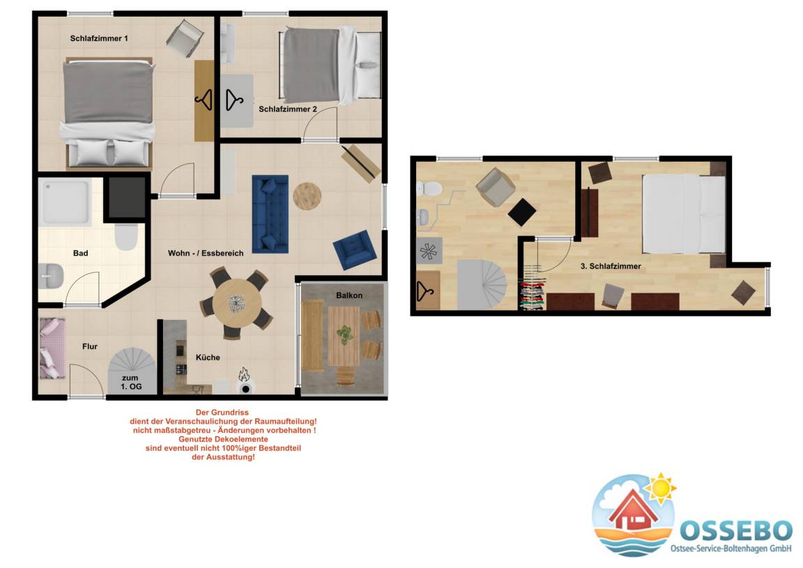 Im Wohnbereich, welches sich in der ersten Wohnebene befindet, sorgen bequeme Ledermöbel für Wohnkomfort, der vorhandene Flatscreen-TV sorgt für die Multimediaunterhaltung. Von hier aus gelangen Sie auf den möblierten Nordost-Balkon mit tollem Ostseeblick (im Frühjahr/ Sommer etwas eingeschränkter durch ein paar Bäume).