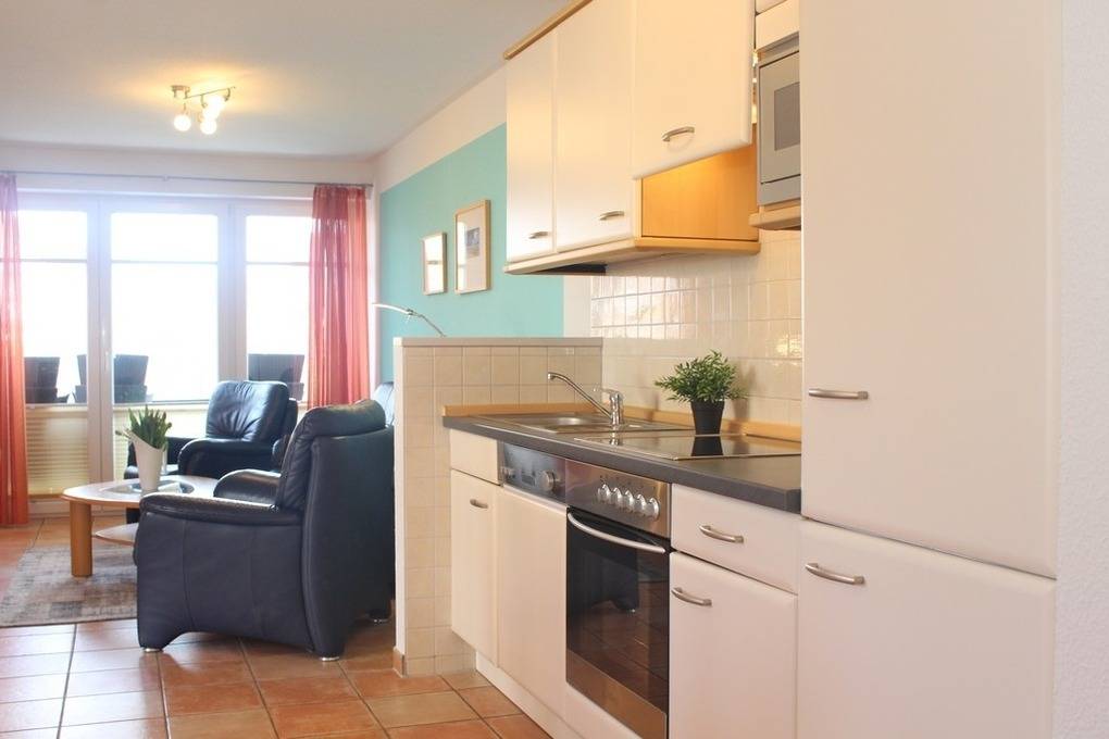 Zum großzügigen Wohnbereich mit bequemer Couchgarnitur und Flatscreen-TV sowie Stereoanlage gehört auch eine bestens ausgestattete offene Küchenzeile, u.a. mit Mikrowellengerät und Geschirrspüler sowie eine separate Essecke.