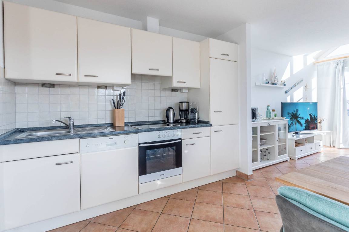 Außerdem befindet sich hier eine moderne offene Küchenzeile mit Spülmaschine, Herd und Mikrowelle uvm., sodass einer kompletten Selbstverpflegung nichts im Wege steht.