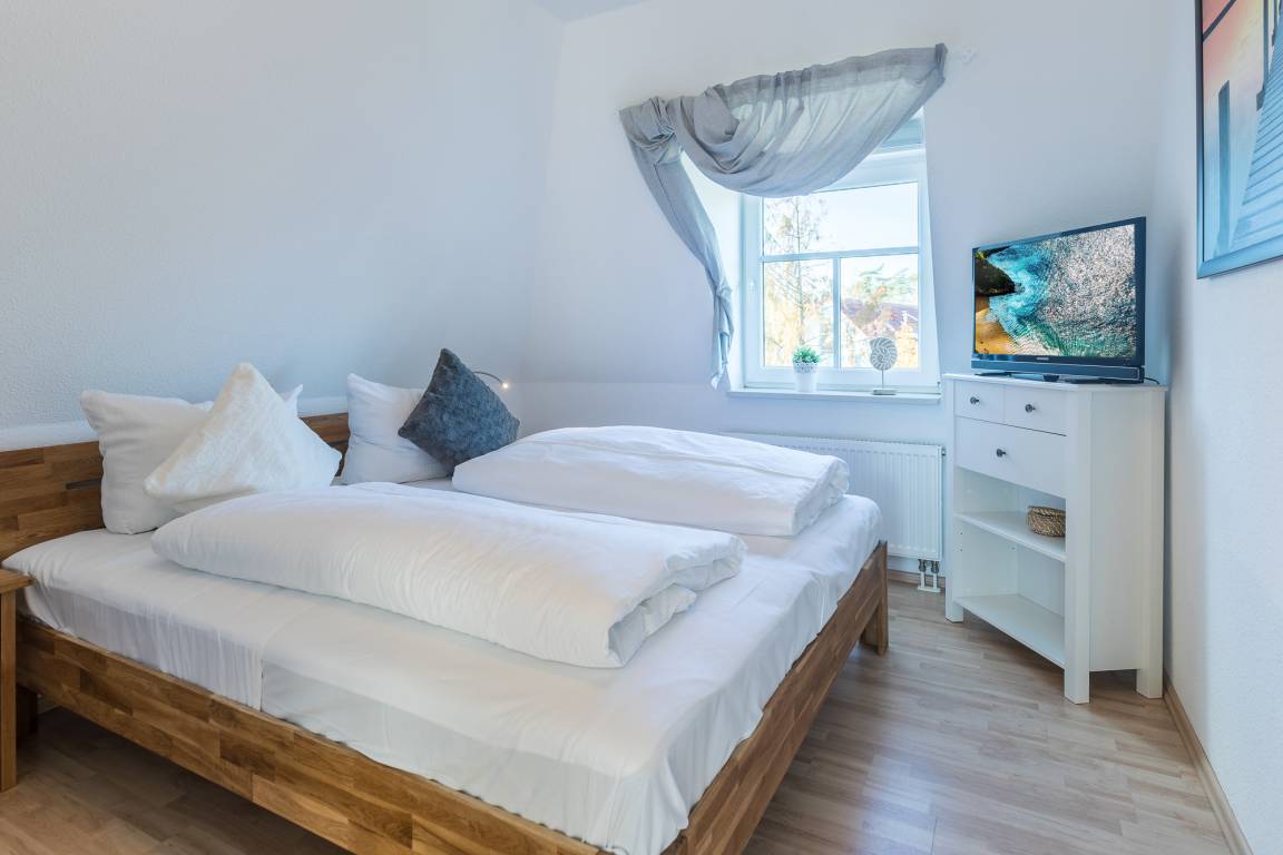 Während das Schlafzimmer mit einem gemütlichen Doppelbett, Kommode und einem weiteren Flatscreen-TV sowie Kleiderschrank eingerichtet ist, bietet das Gäste-/ Kinderzimmer zwei Einzelbetten, einen Kleiderschrank und ein Bücherregal. Ein Reisebettchen kann im Schlafzimmer aufgebaut werden.