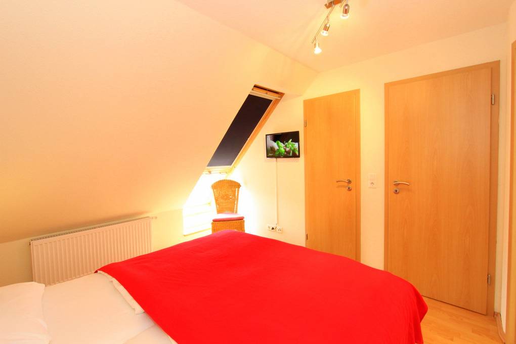 Hier ist ein Schlafzimmer mit Doppelbett (180x200cm/ Höhe 50cm) eingerichtet. An der Wand befindet sich ein Flatscreen-TV. Für Ihre Garderobe finden Sie auf dieser Etage einen kleinen begehbaren Kleiderschrank mit Regalen, einer Kommode sowie einer Kleiderstange. Das Rollo dunkelt das Zimmer hervorragend ab.