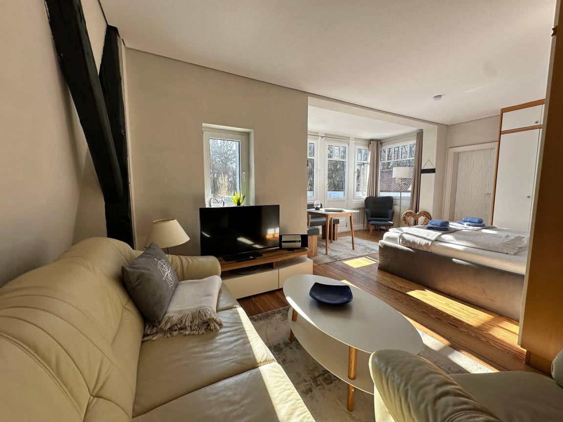 Unsere grosse (43m²) Einzimmer-Ferienwohnung in der ersten Etage mit grosser nach Süden ausgerichteten Dachterrasse ist die ideale Unterkunft für 2 Personen. Der sonnige Wohn-Schlafraum mit gemütlicher Couchlandschaft einem Doppelbett und Einbauschränken verfügt über Satelliten-TV, kostenlosem WLAN- Anschluss, Radio, grosse komplett eingerichtete Küchenzeile und eine Essecke.