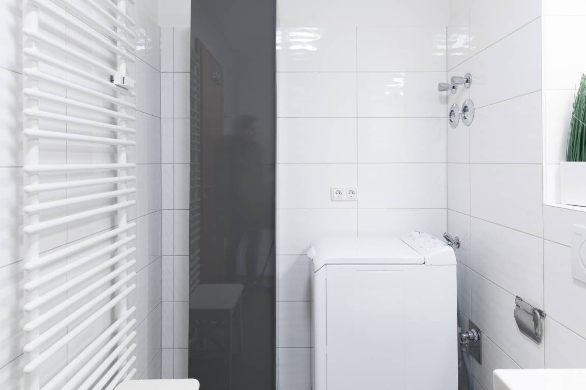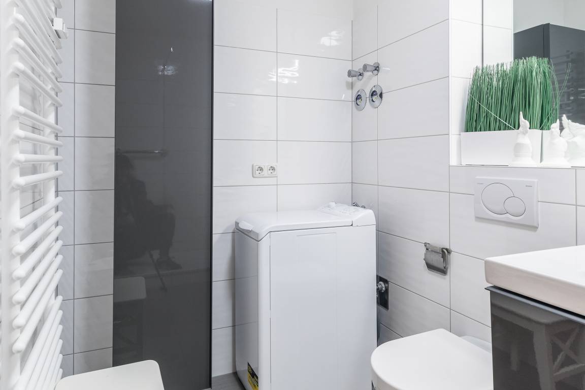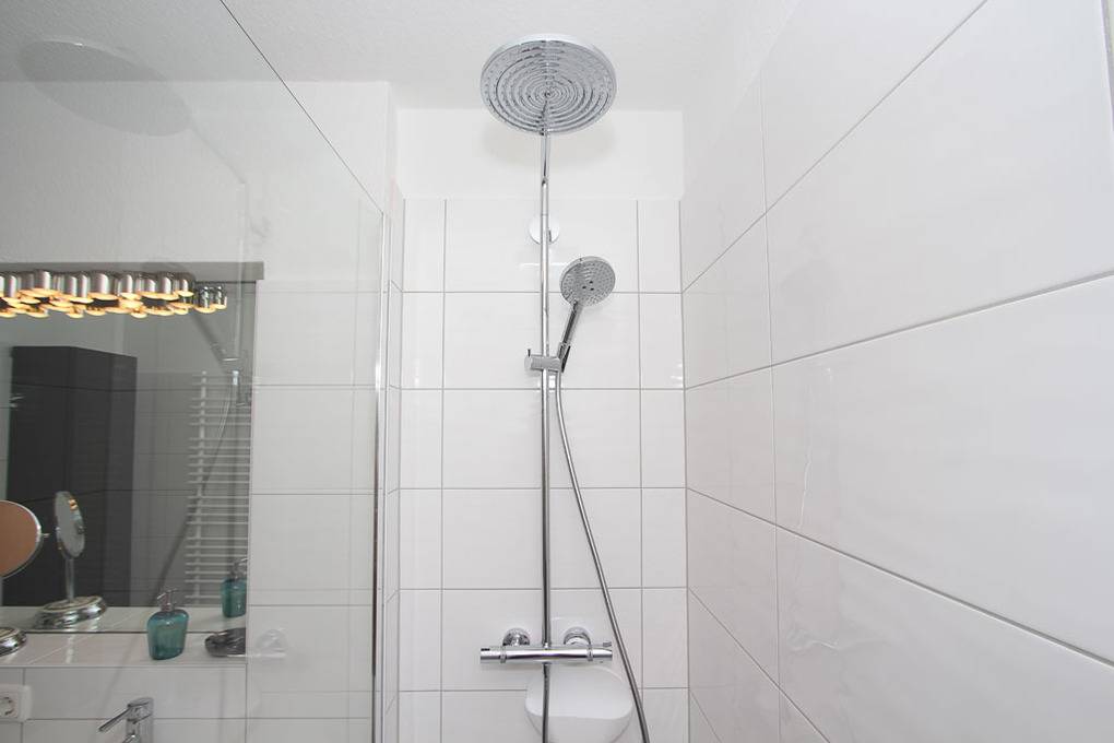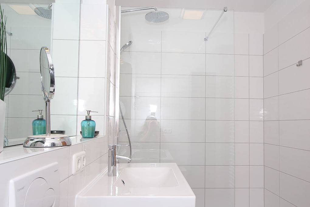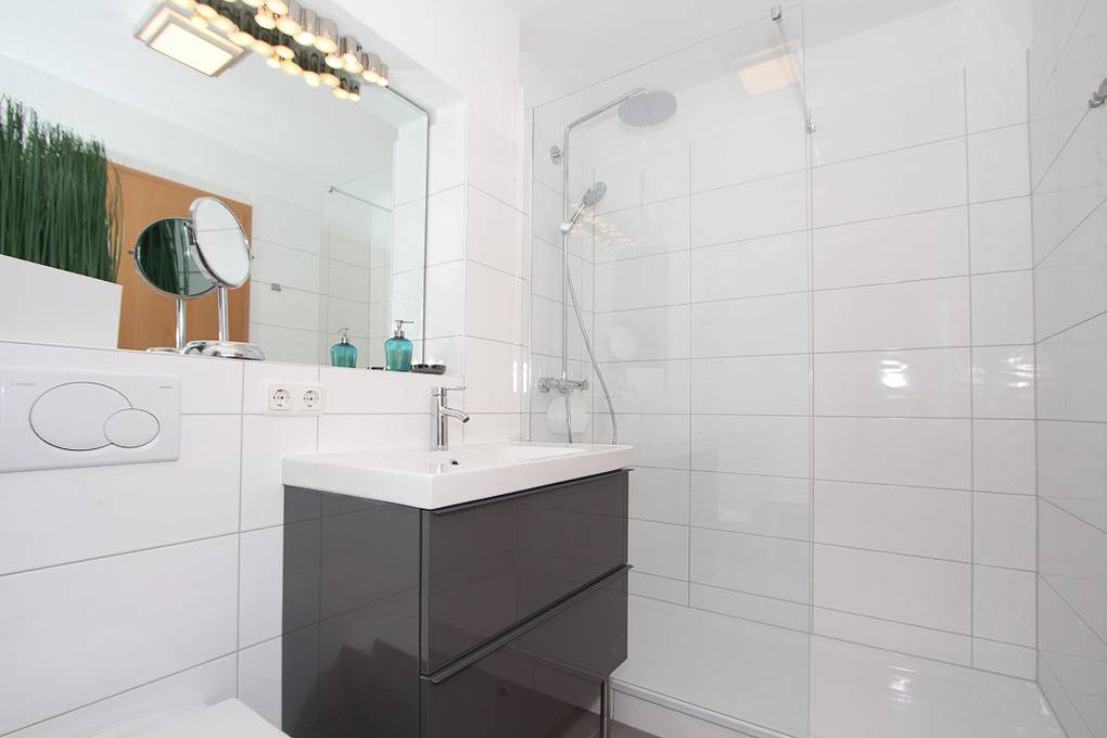 Das Badezimmer bietet Waschtisch, Dusche und WC. Auch der Eingangsbereich ist einladend eingerichtet.
