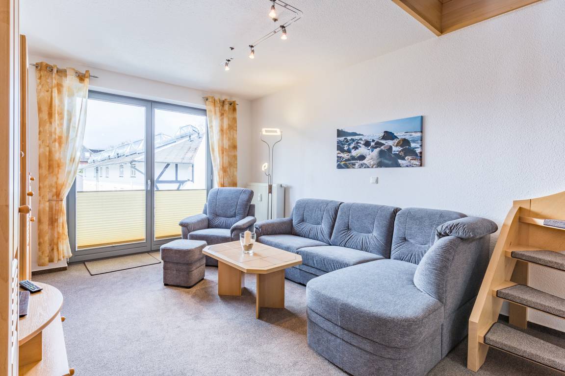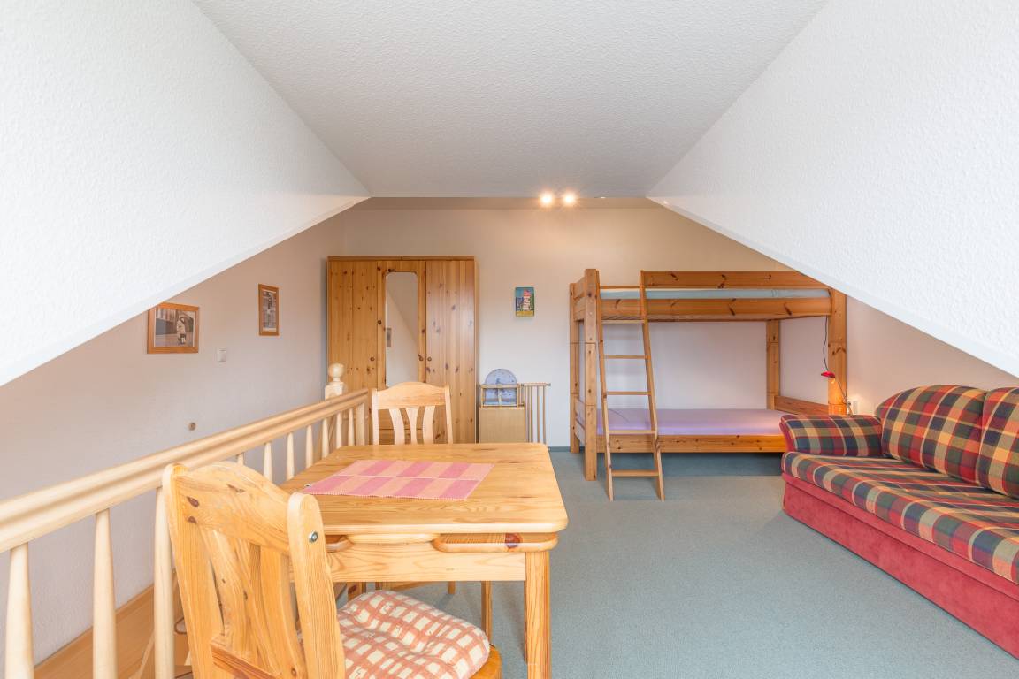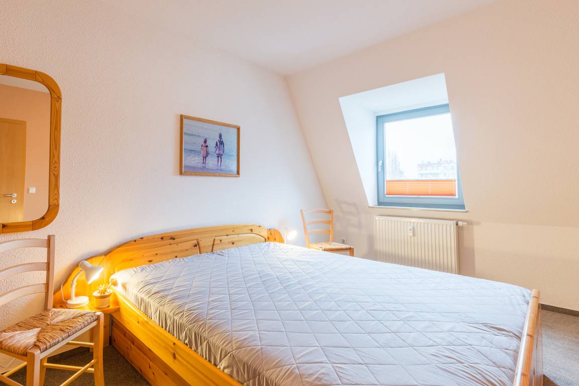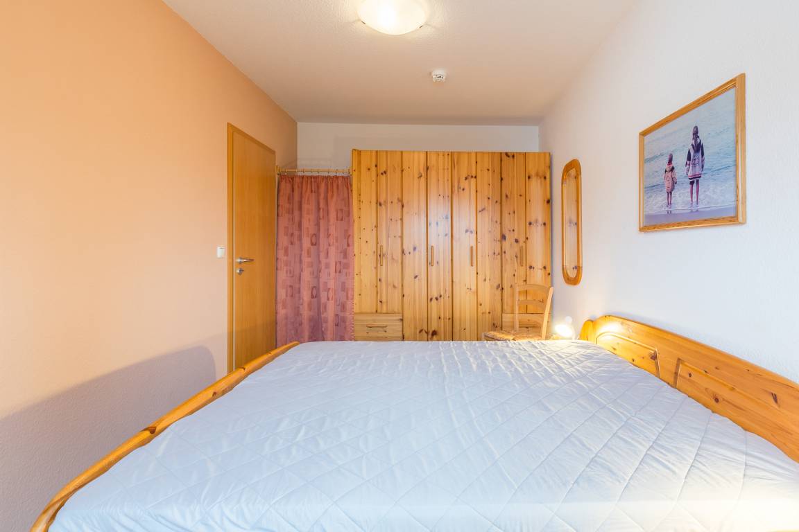 Über den Wohn- und Essbereich haben Sie direkten Zugang zum Balkon. Die Ferienwohnung bietet mit zwei separaten Schlafzimmern, 1 Doppelbett (180x200) mit geteilter Matratze, 1 Etagenbett ( 90 x 200 cm ) und 1 Schlafcouch ( 150 x 200 cm ), Platz für bis zu 4 Personen.