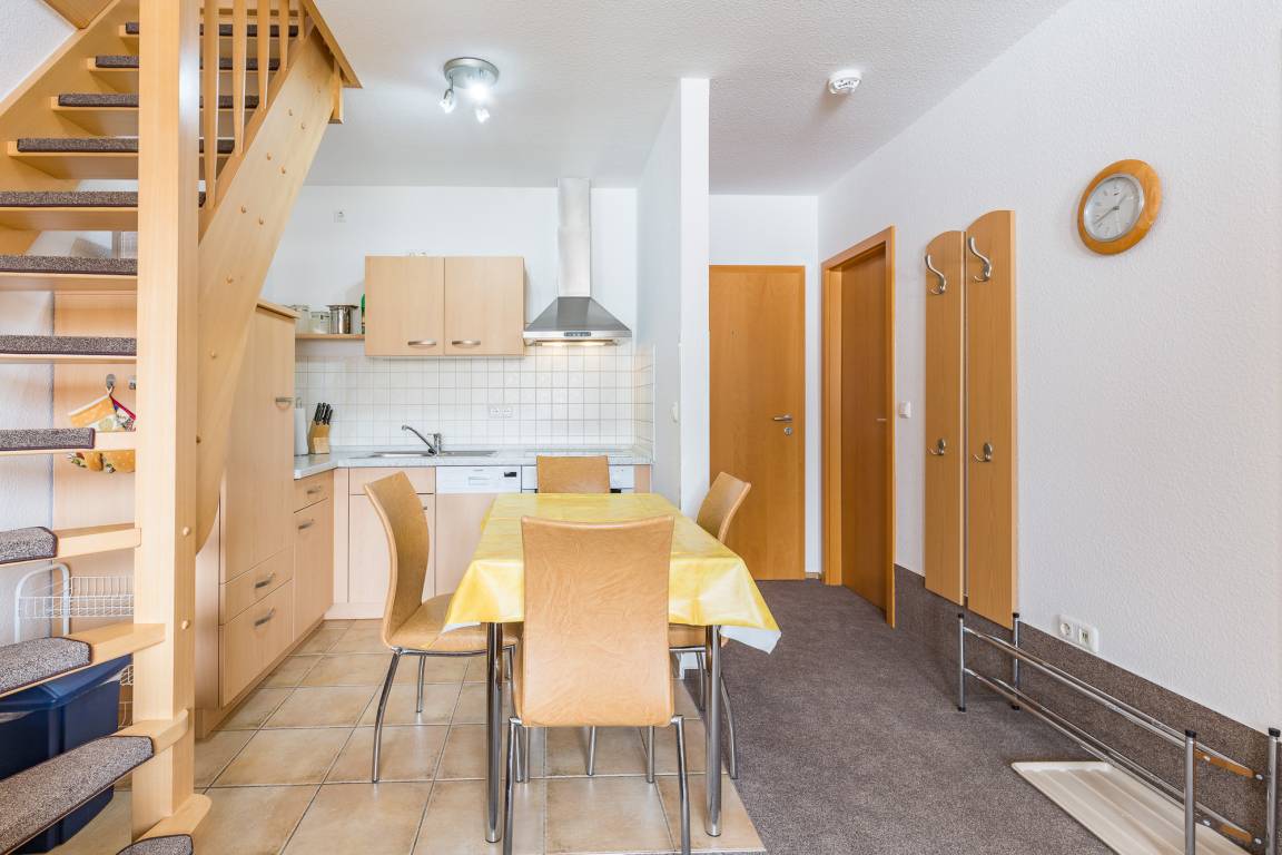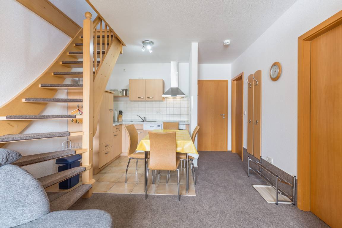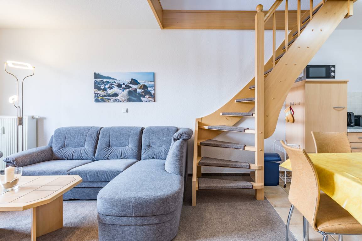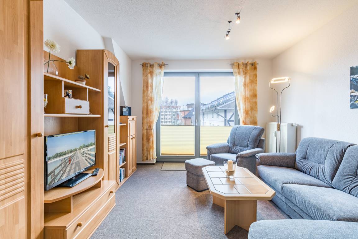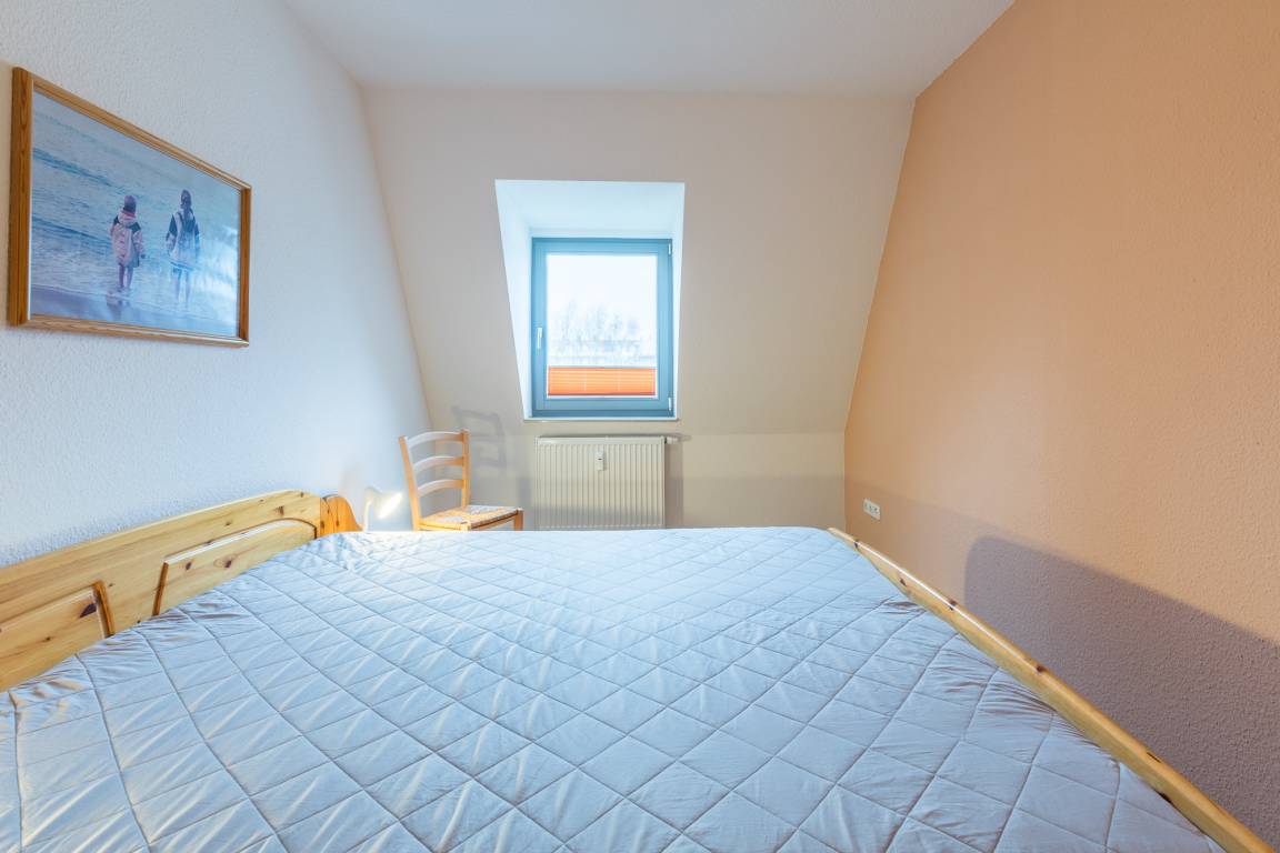 Über den Wohn- und Essbereich haben Sie direkten Zugang zum Balkon. Die Ferienwohnung bietet mit zwei separaten Schlafzimmern, 1 Doppelbett (180x200) mit geteilter Matratze, 1 Etagenbett ( 90 x 200 cm ) und 1 Schlafcouch ( 150 x 200 cm ), Platz für bis zu 4 Personen.