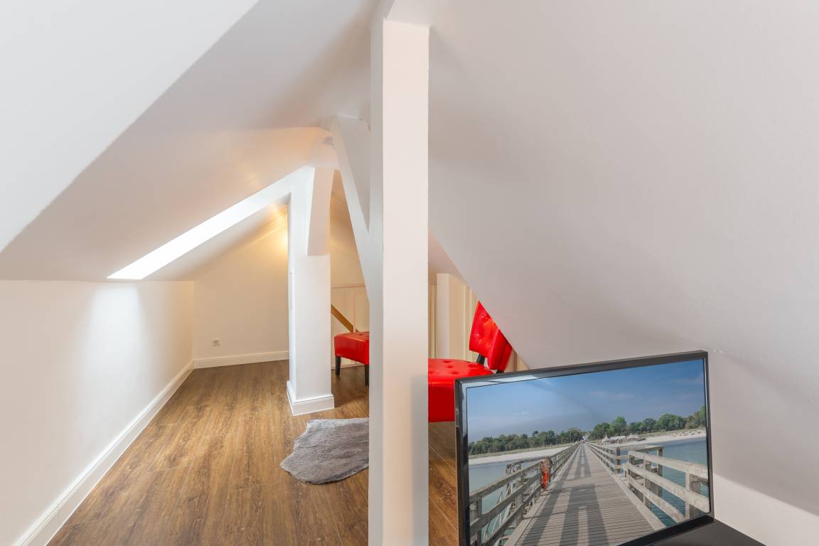 Aus diesem lichtdurchflutetem Appartement auf 2 Etagen sehen Sie die Ostsee direkt. Hier punkten Helligkeit, Großzügigkeit und Komfort mit eigenem geräumigen Balkon. Eine offene Wohnküche bietet Gemütlichkeit. Im ersten Schlafzimmer freuen Sie sich über einen Kamin und einen zusätzlichen Flat-TV. In der Maisonette ist ebenfalls ein TV und Platz, damit die Kinder in Ruhe spielen können. Kinderreisebett und Kinderhochstuhl können bei Bedarf kostenpflichtig dazugebucht werden. Strandurlaub. Komfort. Natur. Ruhe. Ostsee.