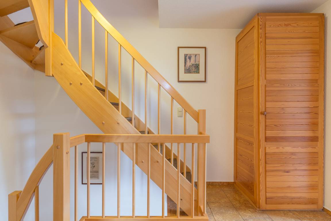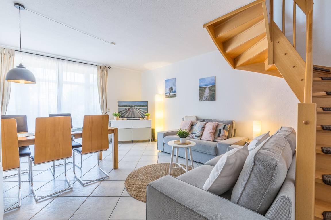 Ein 23 m² großer Wohn- und Essbereich mit Flatscreen, Stereoanlage und DVD-Player bietet Ihnen Raum zur Erholung. Die Treppe zu den 3 Schlafzimmern hat einen steilen Aufstieg.