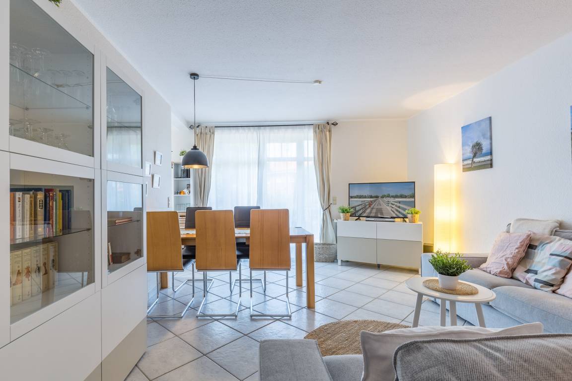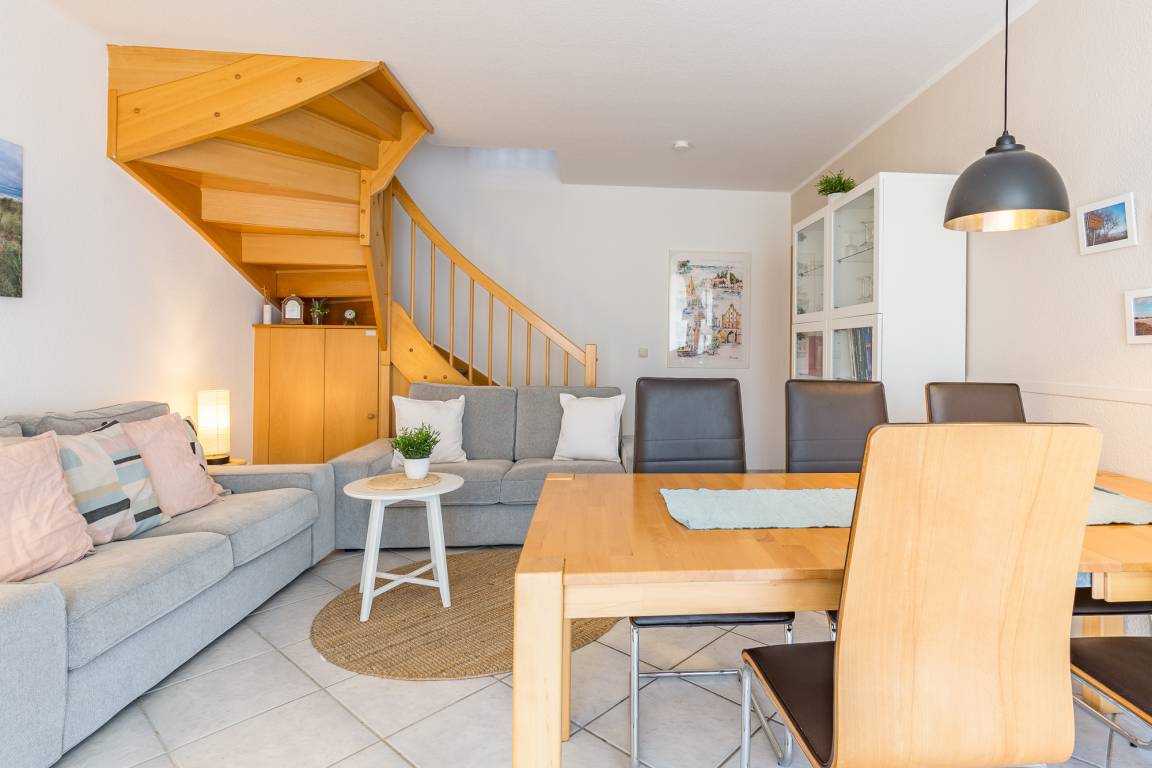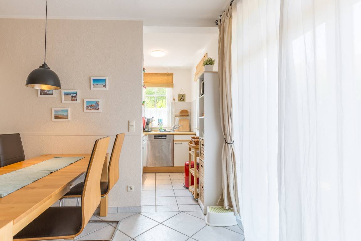 Sie betreten das Ferienhaus und befinden sich im Flur. Von hier aus erreichen Sie das Wohnzimmer mit Essbereich. Am Esstisch haben sechs Personen Platz. Vom Wohnbereich aus gelangen Sie in die offene Küche. Sie ist mit allem ausgestattet, was Sie im Familienurlaub für die Zubereitung Ihrer Mahlzeiten benötigen. [nbsp]