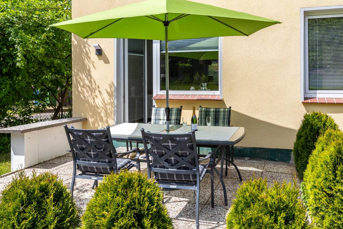 Auf der Südost-Terrasse finden Sie moderne Aluminium-Gartenmöbel vor und genießen den schönen Blick auf den eingezäunten ( Zaun/ Hecke) Garten.