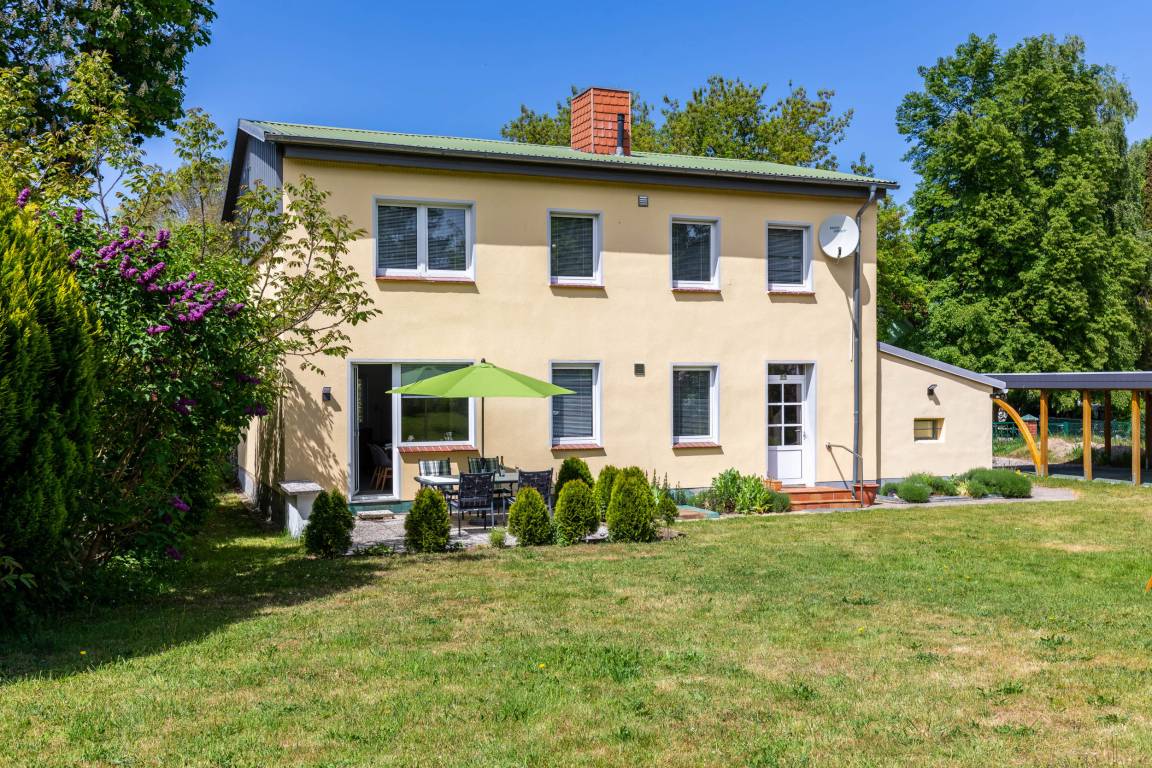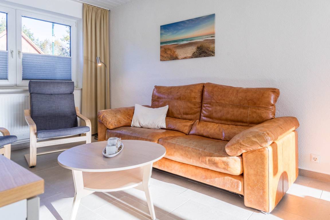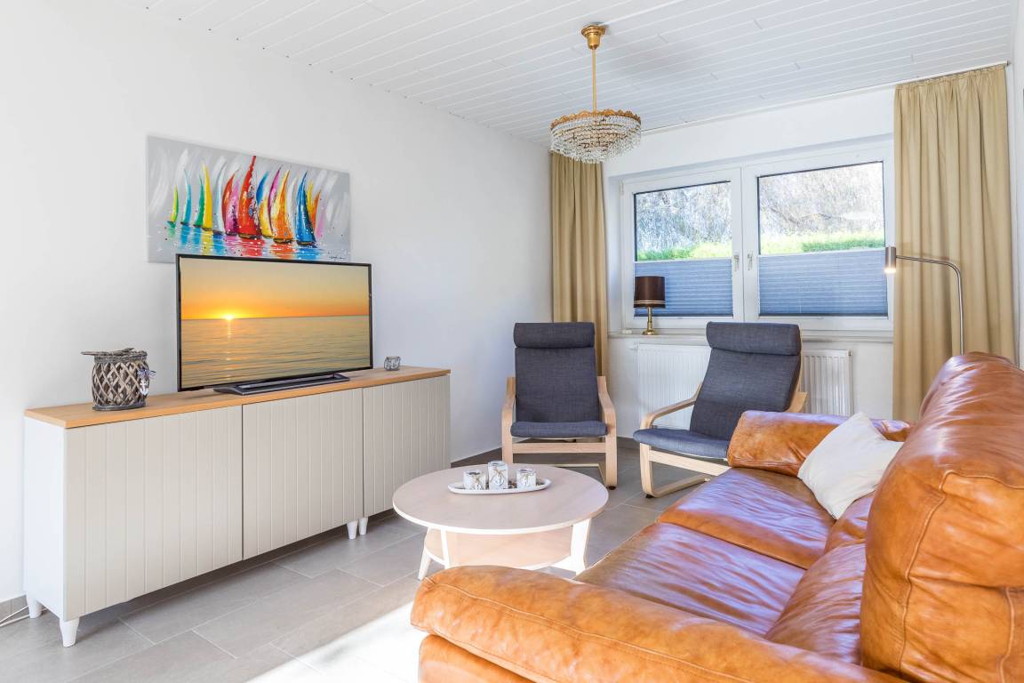 Im großzügigen Wohnbereich finden Sie Polstermöbel, die zum Entspannen einladen. Für Unterhaltung sorgt der große SAT-TV. Ein moderner Esstisch mit Blick in den Garten komplettiert die Einrichtung.