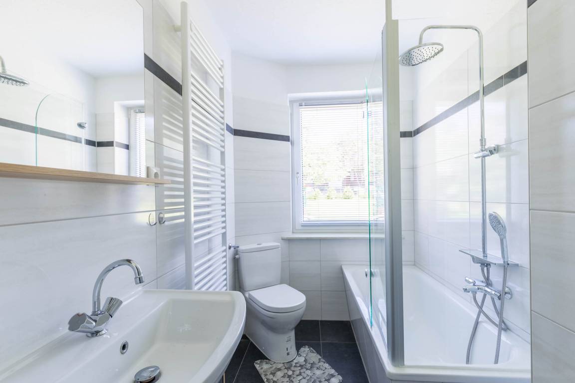 Das Badezimmer ist mit einer Badewanne mit integrierter Duschvorrichtung sowie WC ausgestattet.