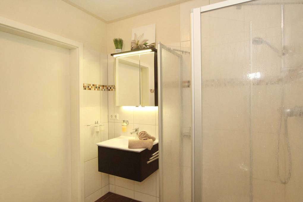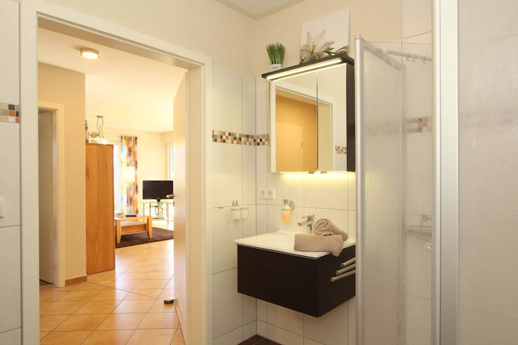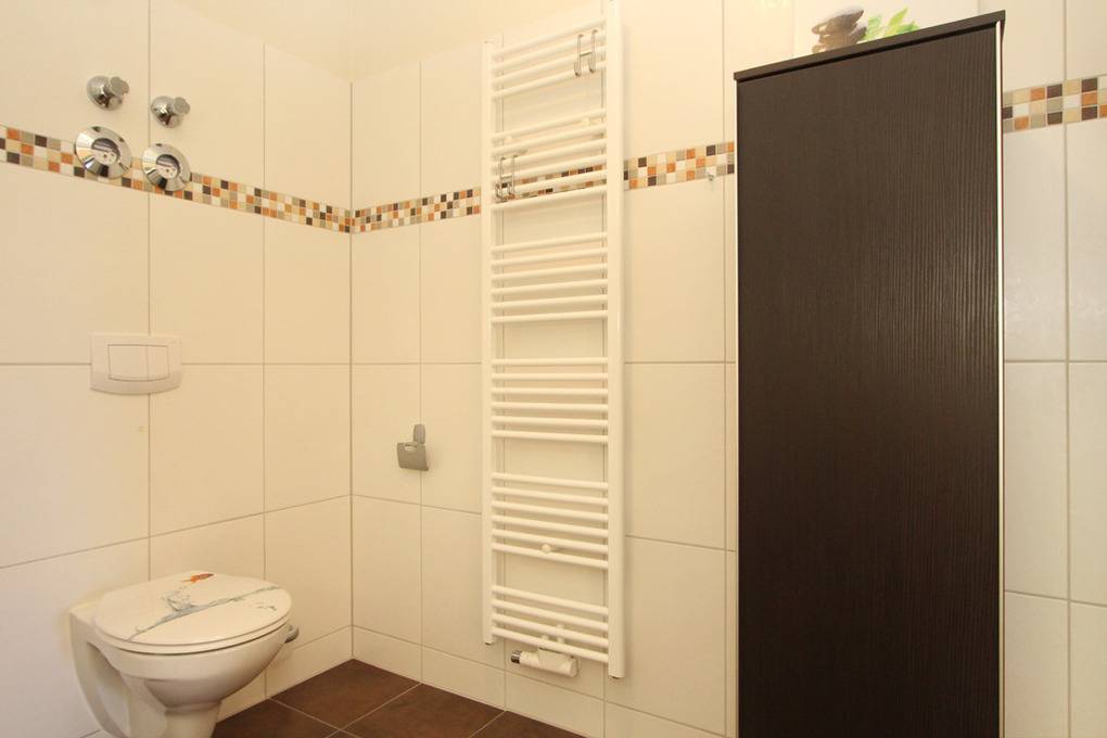 Das barrierefreie Duschbad mit WC ist hell gefliest und modern eingerichtet. Eine große Handtuchheizung sorgt zusätzlich für wohlige Wärme.