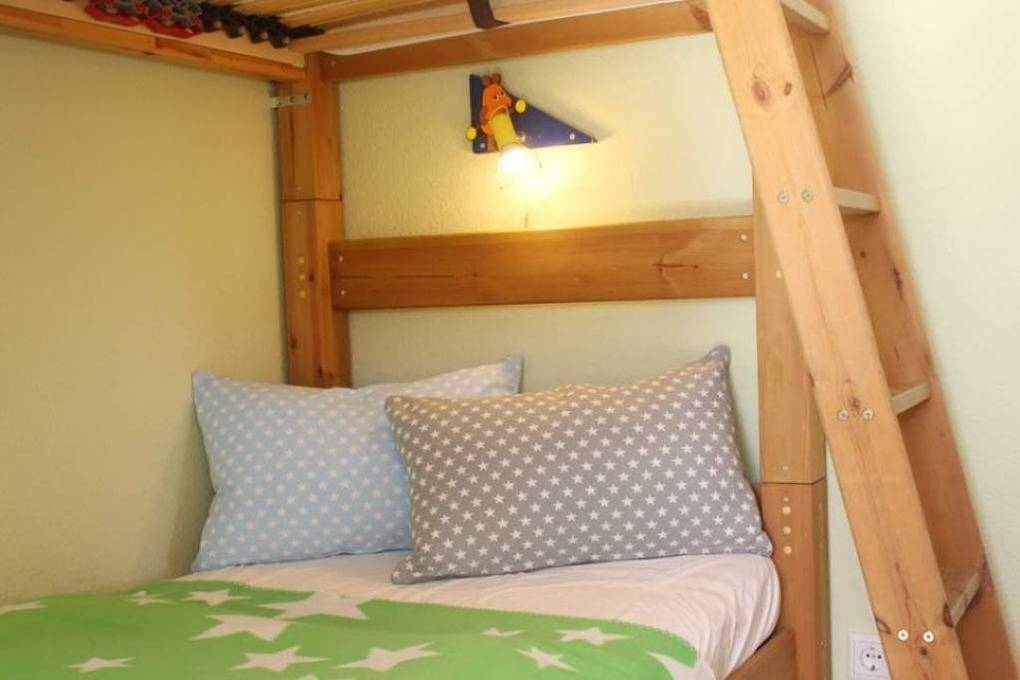 Das Gäste-/ Kinderzimmer ist kinderfreundlich gestaltet und bietet ein festes Holzgitterbett für die ganz kleinen Gäste sowie ein Etagenbett (je 90x200cm/ Höhe unten 49cm und oben 156cm), in dem auch Erwachsene ausreichend Platz finden könnten. Auch ein schöner Schreibtisch hat hier einen Platz gefunden. Verschiedene Spiele finden Sie ebenfalls in dem hier vorhandenen Schrank.