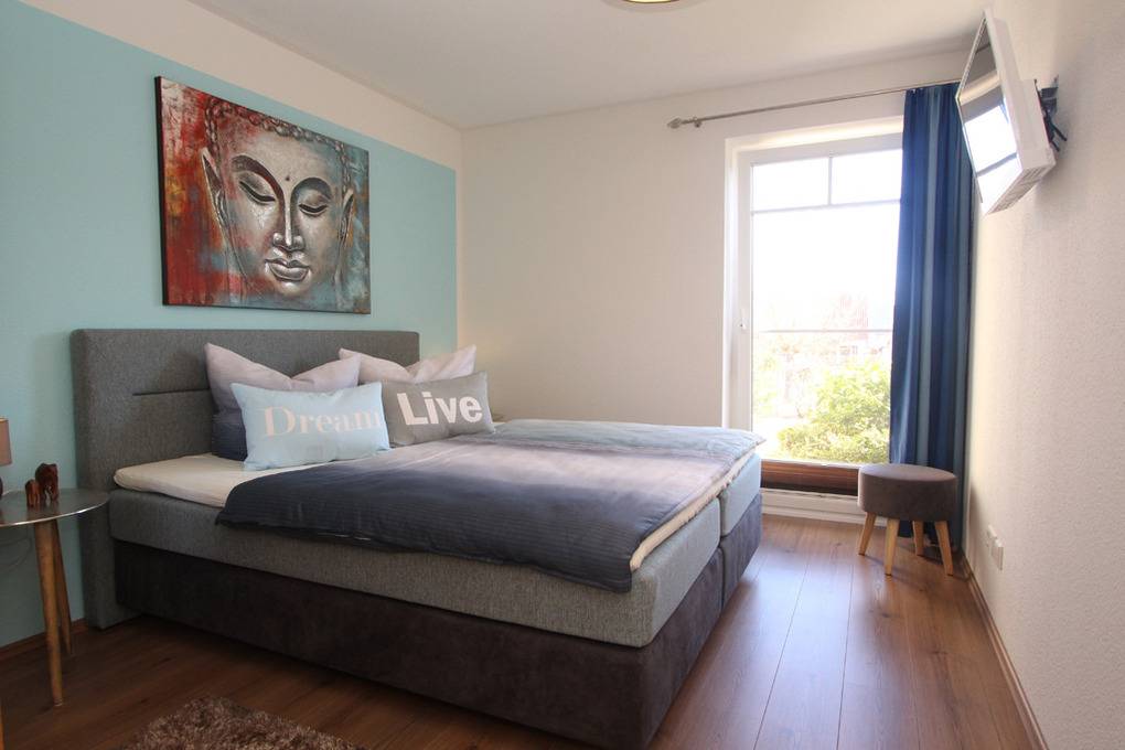 Das Schlafzimmer lädt mit einem komfortablen Boxspringbett (180x200cm/ Höhe 62cm) für zwei Personen und einem LED-TV an der Wand zu kuscheligen Filmabenden im Bett ein.