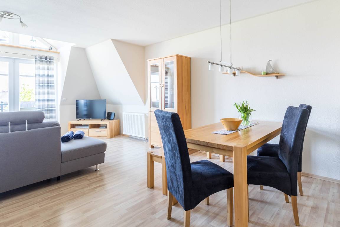 Viel Licht und Platz erwarten Sie liebe Gäste in dieser 3-Zimmer-Ferienwohnung im 2.Obergeschoss (DG). Sie bietet eine familienfreundliche Ausstattung für 4 Personen + Kleinkind.