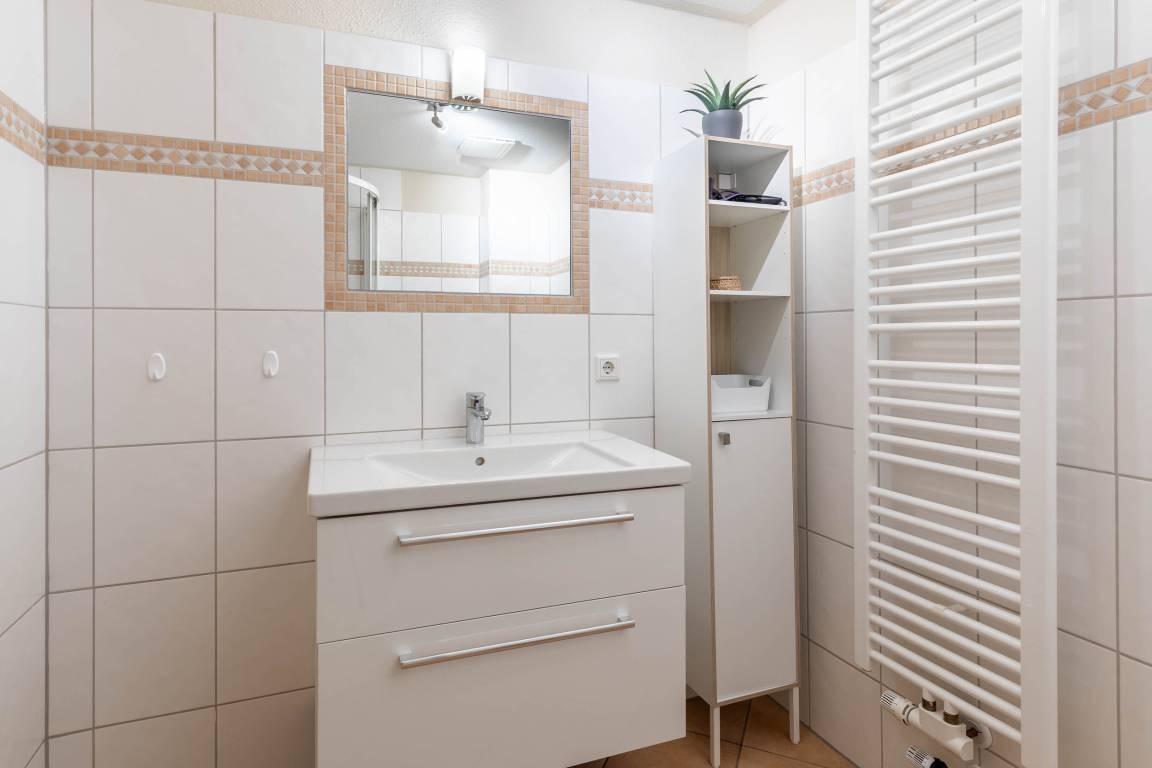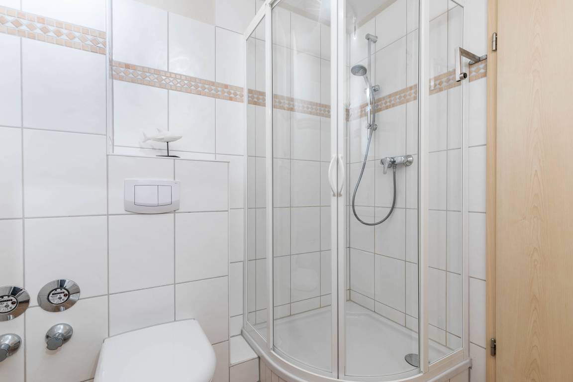 Zur Wohnung gehören des Weiteren ein helles Bad mit Dusche, WC und Waschbecken.