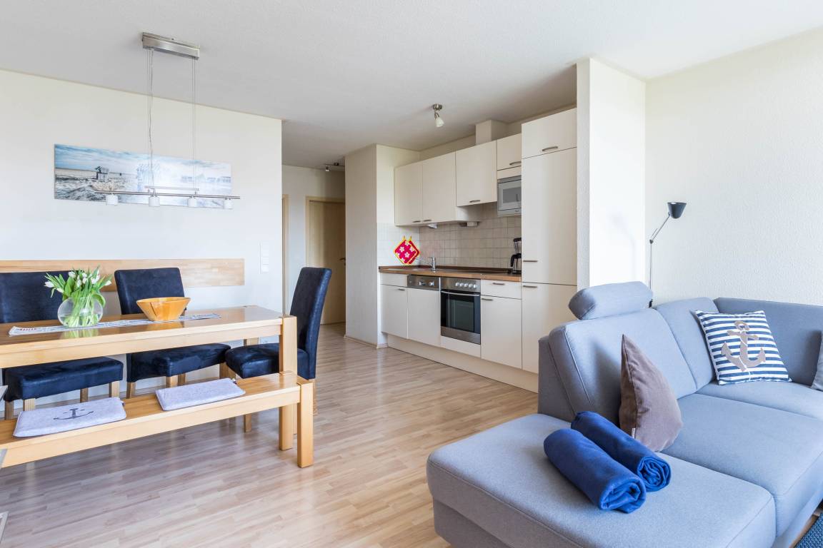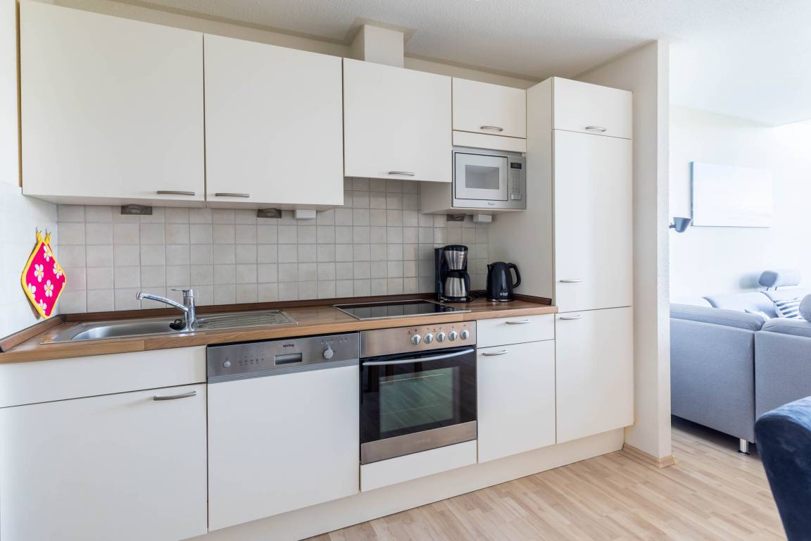 Die offene Küchenzeile ist mit Geschirrspüler, Herd, Backofen und Mikrowelle voll ausgestattet. An der separaten Essecke können Sie bequem Ihre Mahlzeiten einnehmen.