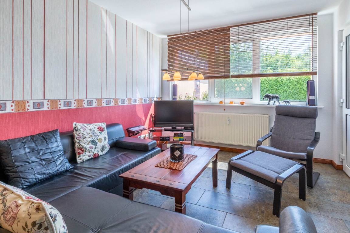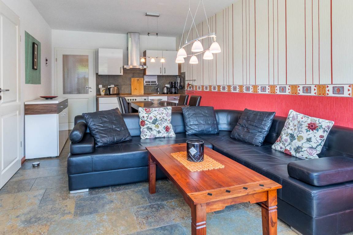 Die 3-Zimmer-Ferienwohnung im Erdgeschoss bietet auf rund 52 m² Wohnfläche eine moderne Ausstattung für bis zu 4 Gäste. Der Wohn- und Essbereich ist wohnlich eingerichtet und verfügt über eine bequeme Sofaecke, TV und Musikanlage.