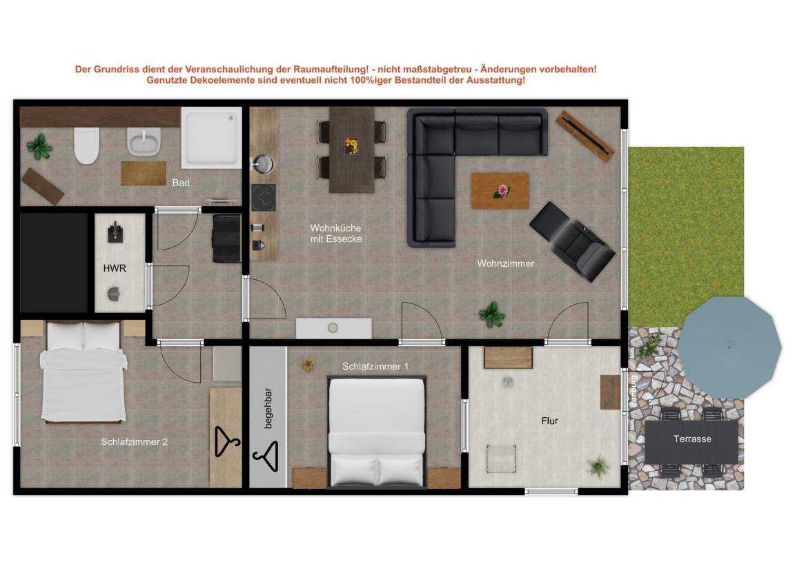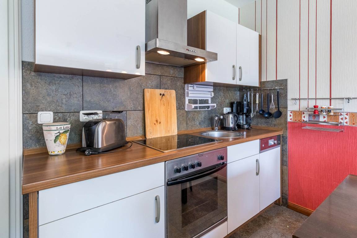 Die offene Küche ist mit Herd/Backofen, Kühlschrank mit Gefrierfach, Spülmaschine sowie Geschirr, Gläsern und Besteck komplett ausgestattet. Von der sonnigen, möblierten Süd-Terrasse gelangen Sie über einen separaten Eingang direkt in die Wohnung.