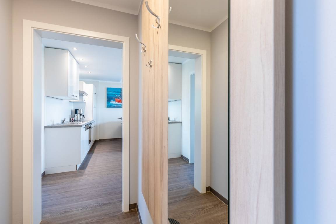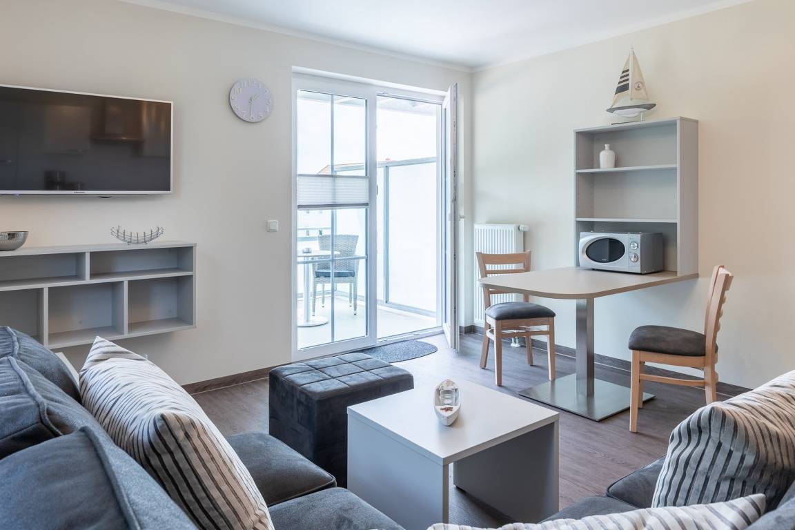 Die hell und modern eingerichtete 2-Zimmer-Ferienwohnung befindet sich im 1.OG und bietet auf rund 58qm Wohnfläche über eine hervorragende Ausstattung für einen unvergesslichen Ostseeurlaub zu Zweit.