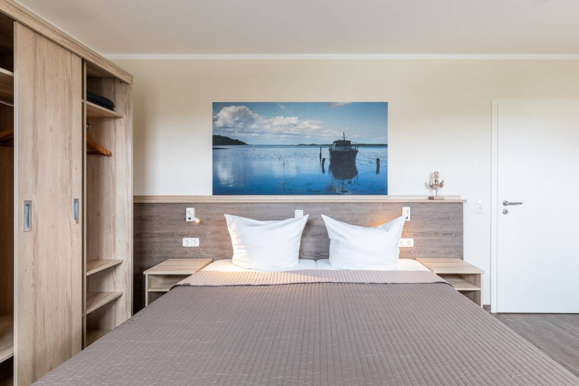 Das Schlafzimmer ist mit einem Doppelbett und einem geräumigen Kleiderschrank ausgestattet. Ein TV ist an der Wand angebracht. Am ebenfalls hier vorhandenen Schreibtisch können Sie bequem z.B. Ihre Urlaubspost schreiben...
