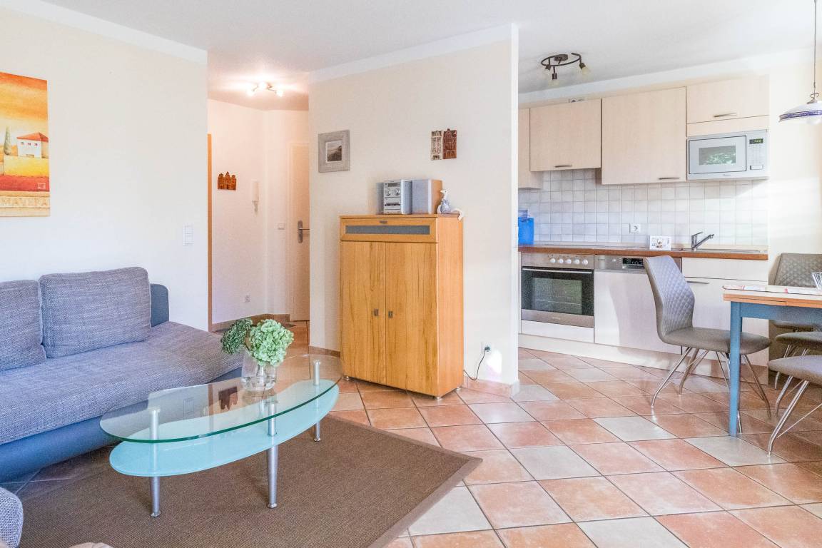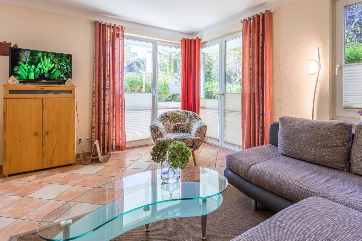 Sie verfügt über einen großzügig geschnittenen Wohnbereich mit gemütlicher Sofalandschaft und einem direkten Zugang auf die möblierte, etwas sichtgeschützte Nordwest/ Nordost-Eckterrasse. Es besteht die Möglichkeit, auf der ausziehbaren Schlafcouch im Wohnzimmer eine Person unterzubringen. SAT-TV, DVD-Player, Musikanlage sowie diverse Gesellschaftsspiele sorgen hier für Ihre Unterhaltung.