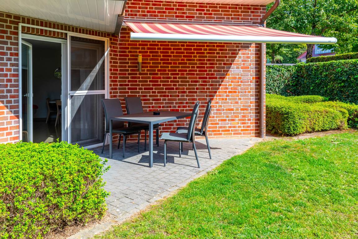 Vom Wohnbereich aus, der mit Flatscreen-TV und Sitzecke ausgestattet ist, gelangen Sie auf die möblierte Südost-Terrasse mit angrenzendem Grundstück, wo Sie die Sonne genießen und die Kinder draußen spielen können.
