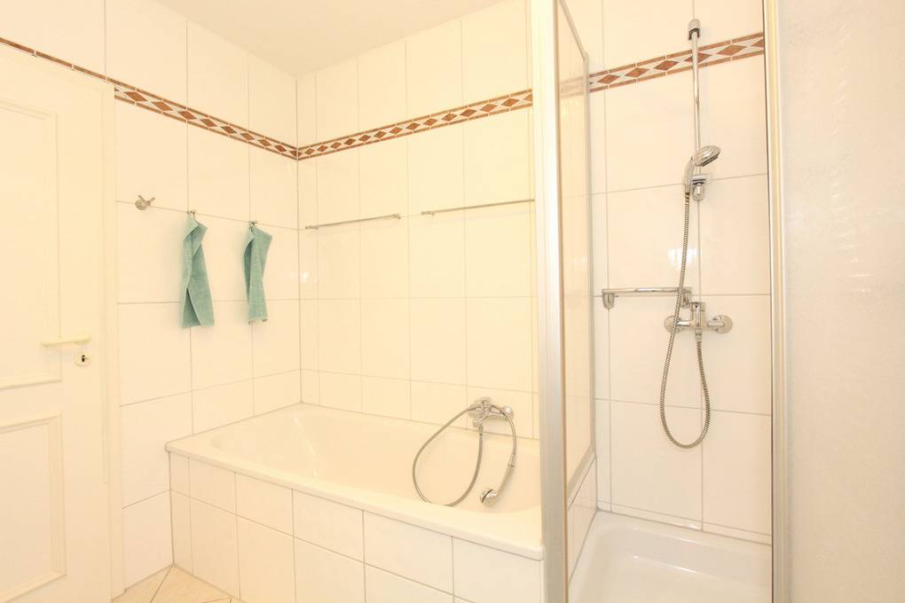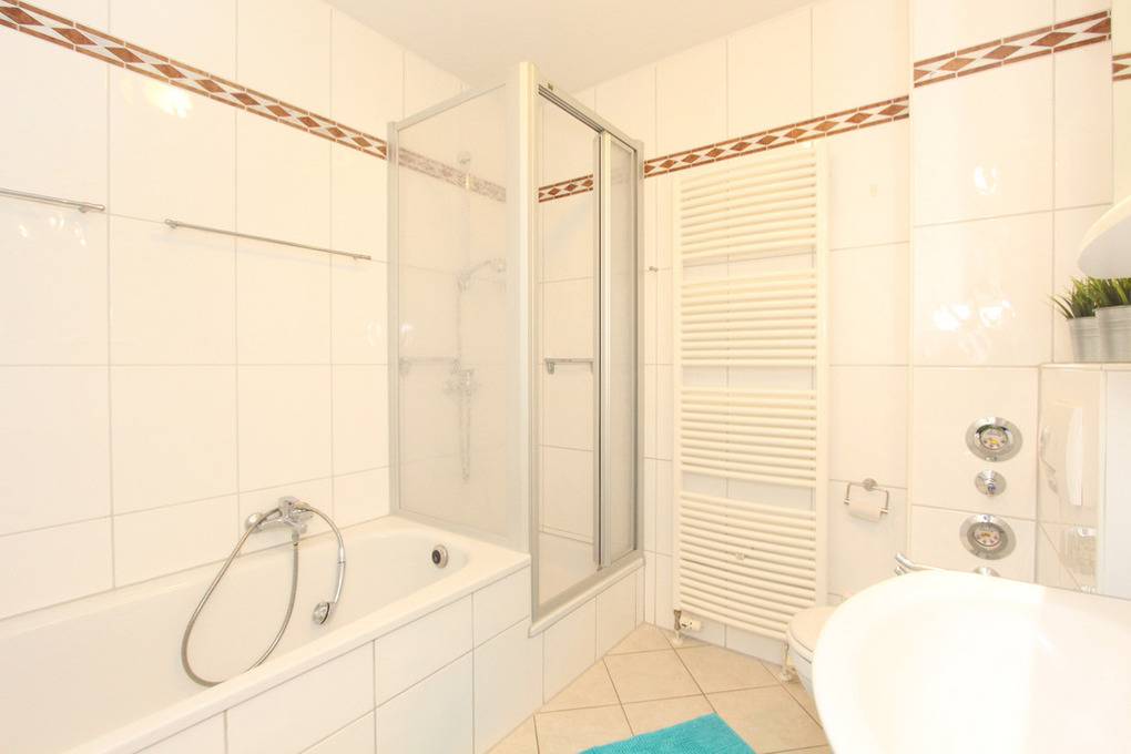 Das hell geflieste Bad besteht aus einer Dusche, Badewanne und einem WC.
