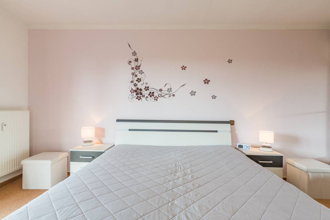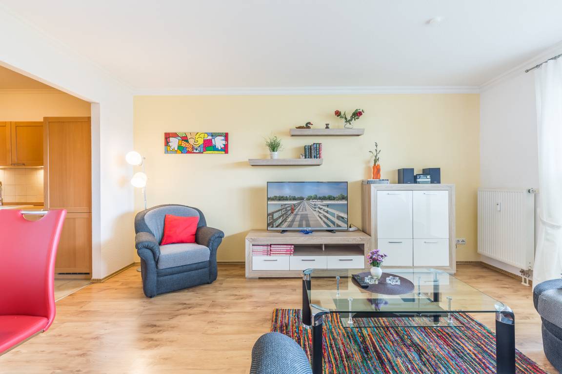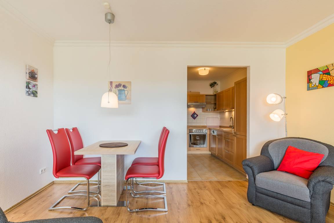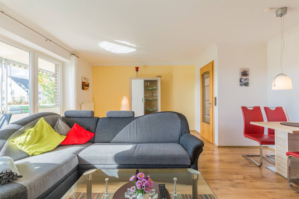 Die komplett ausgestattete Küche mit Gefrierschrank und großer Ablagefläche liegt etwas separat zum Wohnzimmer mit der großzügig gehaltenen Wohnlandschaft aus Sofa und bequemen Einsitzern und einer kleinen Essecke für 4 Personen im hinteren Wohnbereich. Das separate Schlafzimmer enthält ein Doppelbett. Für die dritte Person steht das ausziehbare Schlafsofa im Wohnzimmer zur Verfügung. In der Wohnung ist WLAN verfügbar. In der abschließbaren Garage ist genügend Platz für 3 Fahrräder. Bedenken Sie bitte bei der Anreise, das die Einfahrtshöhe für die Garage maximal 180cm beträgt!