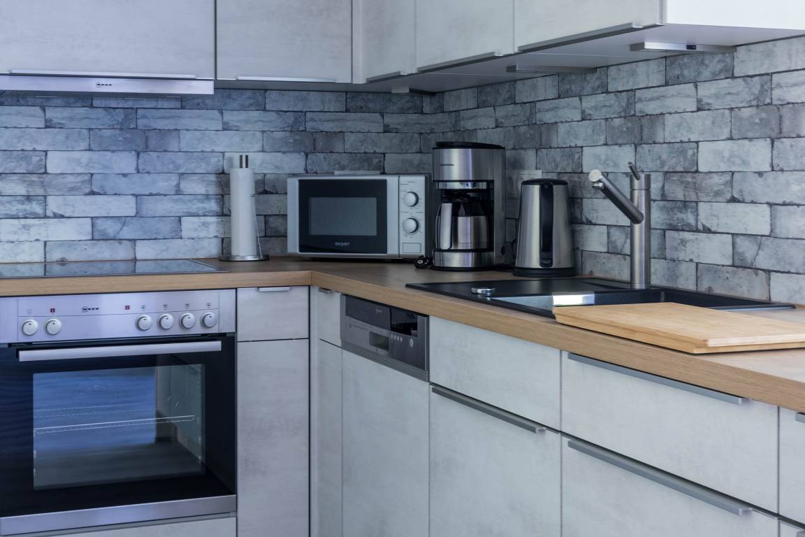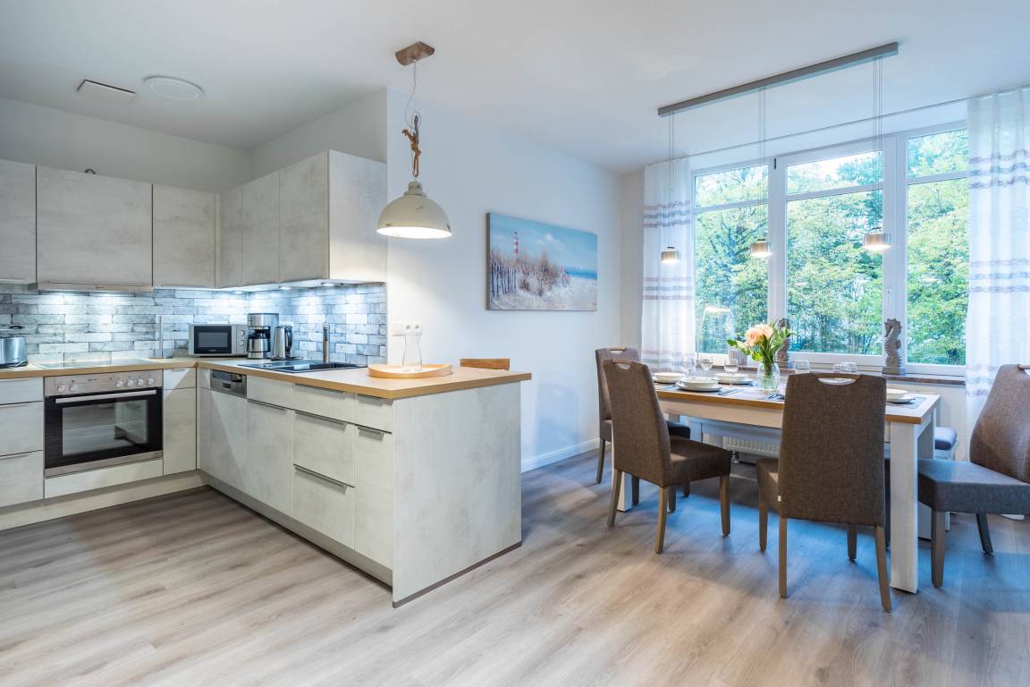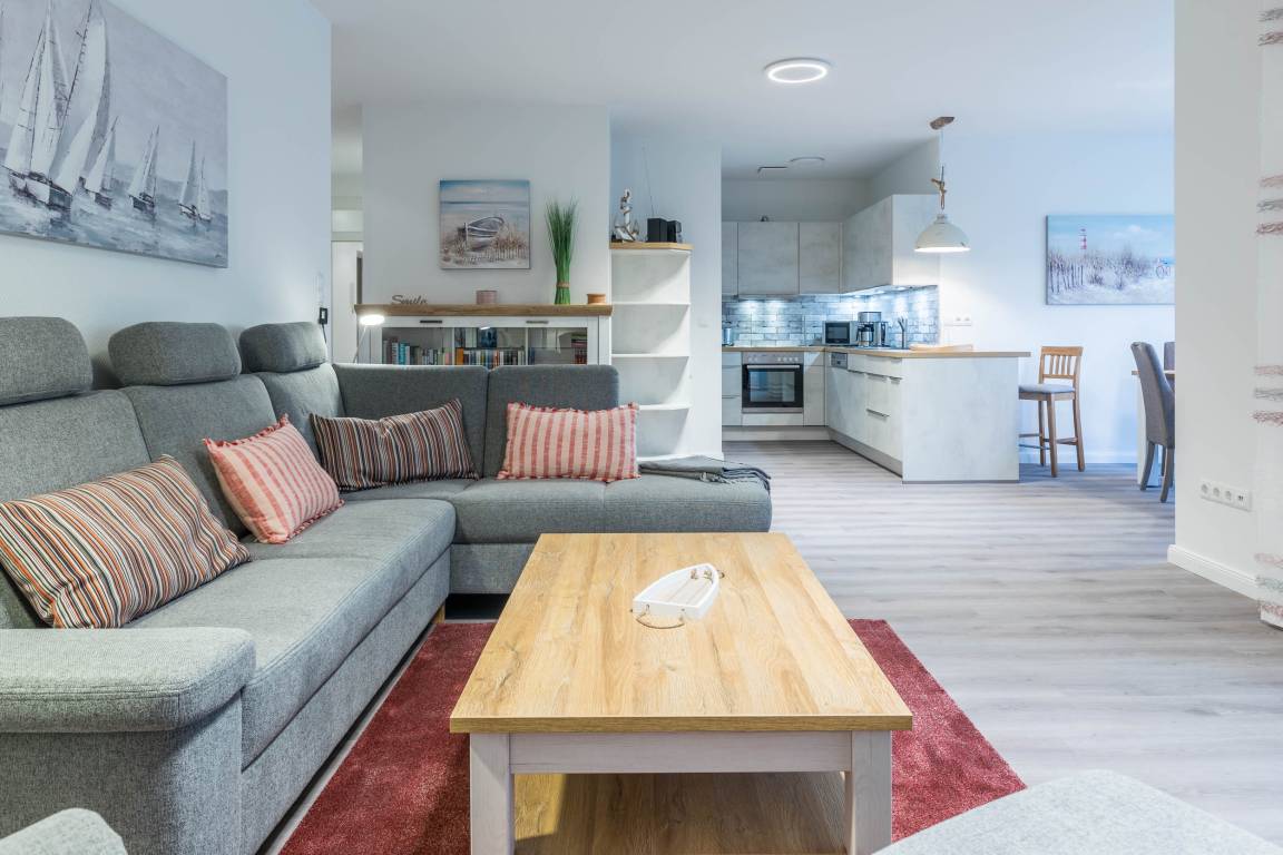 Die moderne offene Küche sorgt für weiteren Komfort und ergänzt das auf das Meer und die Küste abgestimmte Ambiente des Raumes - perfekt für Ihre Selbstversorgung.