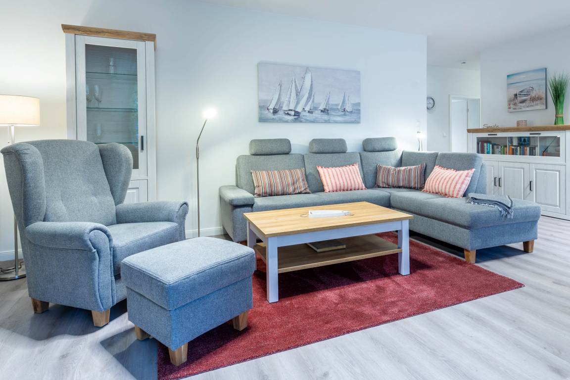 Der große gemütliche Wohnraum lädt mit seiner klassisch-modernen Sofaecke und Omas Ohrensessel zu ruhigen Abenden ein - bei einem Glas Wein oder Tee vor dem Fernseher, vertieft in ein Buch oder einfach mit dem Blick in die Natur. Am großen Esstisch können Sie bei geselligen Mahlzeiten und unterhaltsamen Spielrunden, z.B. mit den vorhandenen Gesellschaftsspielen, ebenfalls einen herrlichen Blick in Richtung Ostsee genießen.
