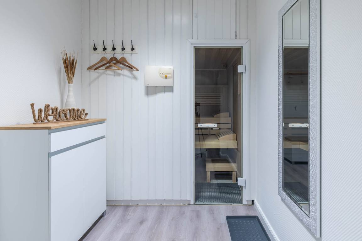 From spring to autumn, the covered loggia with heat radiator and comfortable seating invites you to spend the evenings outdoors and enjoy the sound of the Baltic Sea. For the cooler season, the spacious Finnish sauna is an additional feel-good factor.