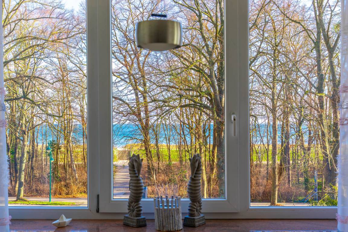 The large cosy living room with its classic-modern sofa corner and grandma's wing chair invites you to spend quiet evenings - with a glass of wine or tea in front of the TV, engrossed in a book or simply with a view of maritime nature. At the large dining table, you can also enjoy a wonderful view of the Baltic Sea during convivial meals and entertaining rounds of board games.