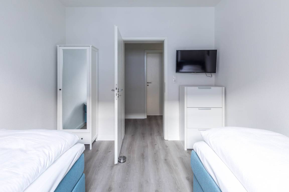 Das Gäste-/ Kinderzimmer ist mit zwei Boxspring-Einzelbetten (je 90x200cm/ Höhe 62cm), Kleiderschrank und TV eingerichtet.