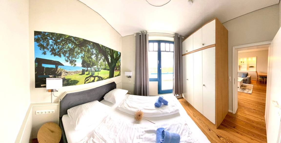 Unsere mit viel Liebe eingerichtete Ferienwohnung "Seeigel befindet sich im Hochparterre der Strandvilla Miramare. Die Zweizimmer Ferienwohnung verfügt über ein Schlafzimmer mit großem kuschligen Doppelbett aus welchem man bei geöffneten Fenstern das Meer rauschen hört.